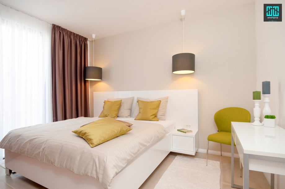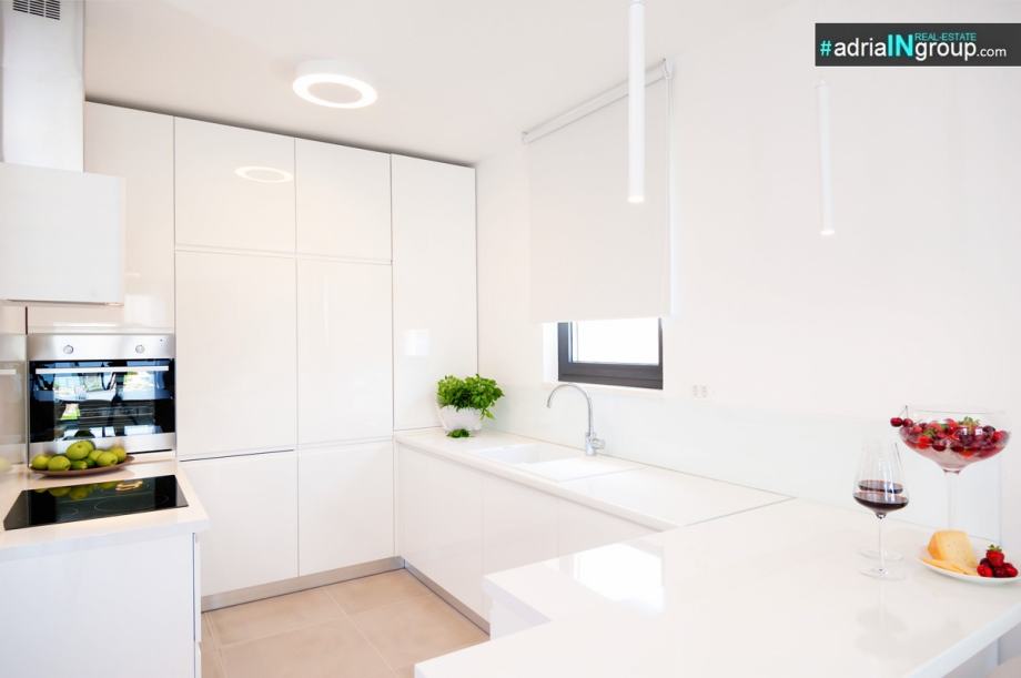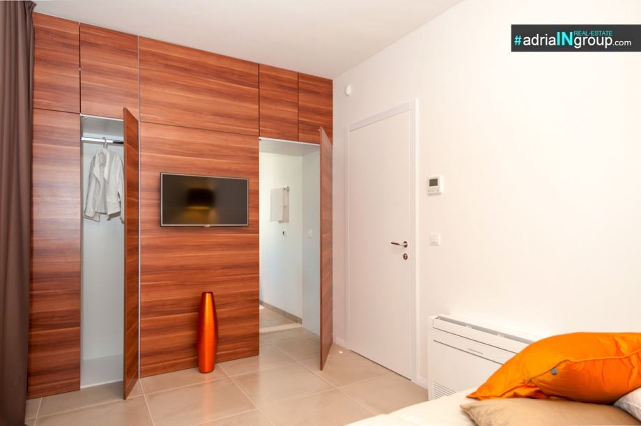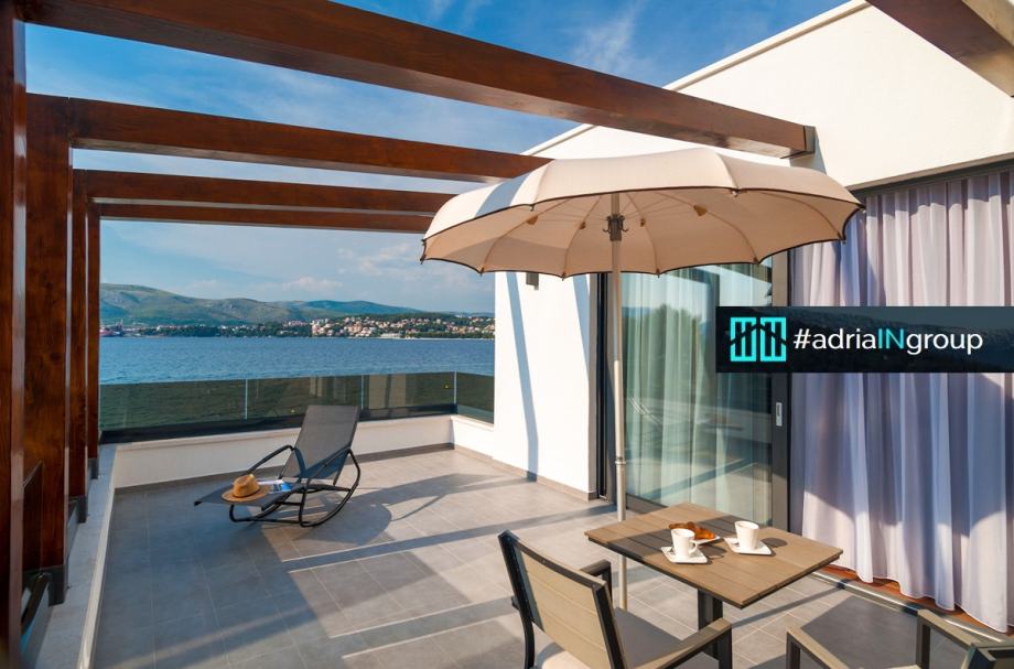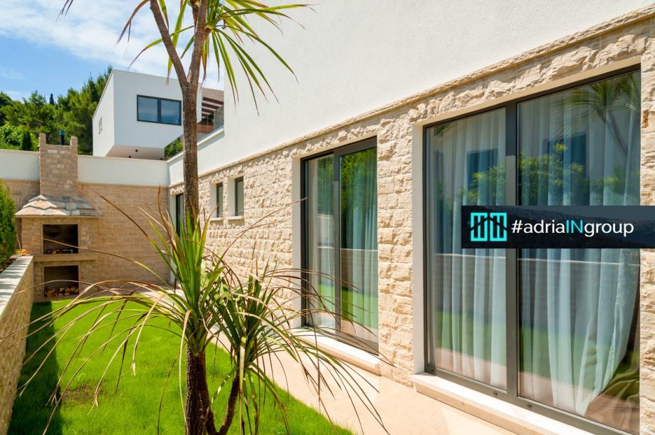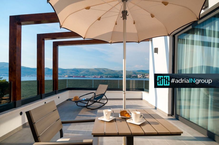 The living area and bedrooms are on the upper floors of this beautiful accommodation. From the terrace, you can enjoy the magnificent panoramic view of the sea, Trogir, and the mountains of the Dalmatian hinterland. The architectural concept of this holiday domicile is excellent and will offer you a pleasant stay.