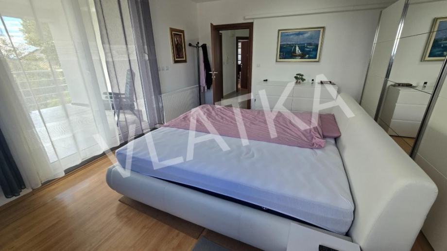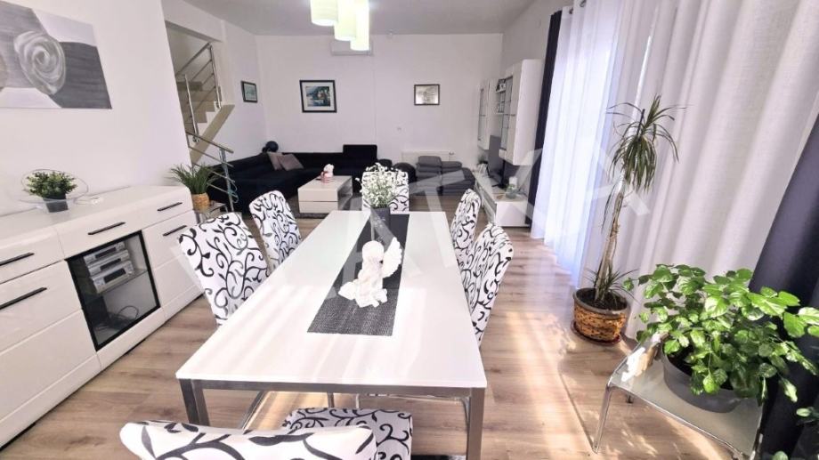 dvoetažni 4-soban stan: garaža 40 m2, konoba, wc, vešeraj, ulazni hodnik u kuću, toalet za goste, kuhinja, ostava, dnevni boravak, blagavaonica, terasa 54 m2 s prekrasnim pogledom na grad.