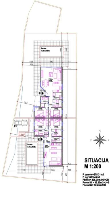 Objekt je ukupne kvadrature 172 m2, a dijeli se na dvije zasebne jedinice - manju kuću od 82,25 m2 koja se prodaje za 435 000 eura i veću od 89,35 m2 koja se prodaje za 495 000 eura. Kuće su koncipirane kao prizemnice, svaka sa dvije spavaće sobe, dvije kupaonice, ostava gdje je predviđena praonica i otvoreni prostor koji objedinjuje kuhinju, blagovaonicu i dnevni boravak sa izlazom na plažu bazena. Veliki otvori u dnevnom prostoru predviđaju staklene stijene koje osiguravaju lijepi pogled na bazen, okućnicu i okolno zelenilo. Svaka kuća ima svoj vlastiti bazen, prilaz i parking. Zasebni bazeni biti će veličine 20 m2 i sa instalacijama koje se mogu prenamjeniti u grijane bazene, s time da će kod veće kuće bazen biti viši od plaže bazena za 20 cm s preljevom na sve četiri strane.