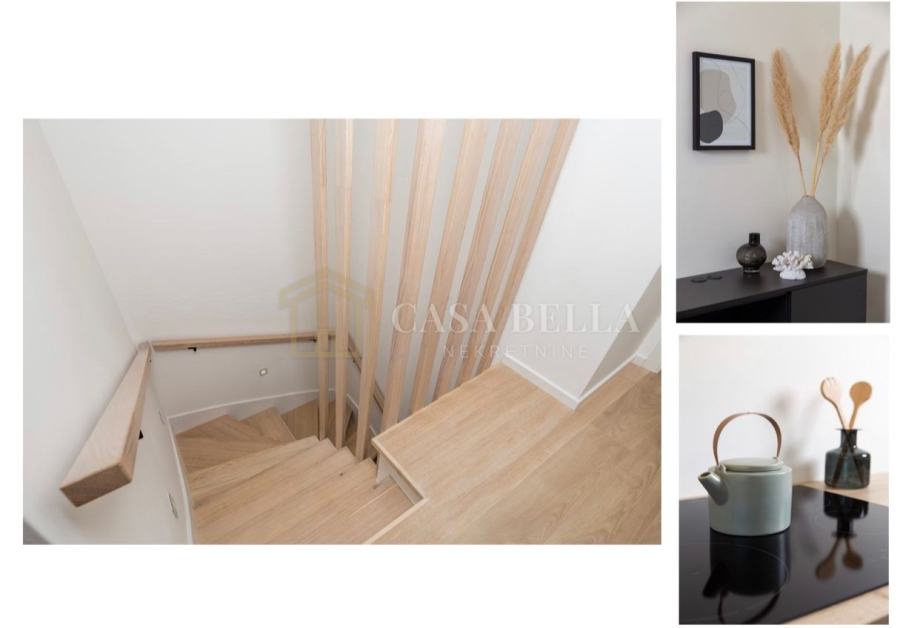 Unutrašnjost je opremljena u skandinavskom prozračnom stilu, sa visokokvalitetnim i prilagođenim namještajem koji osigurava visoku funkcionalnost, ali i podiže estetsku vrijednost kuće.