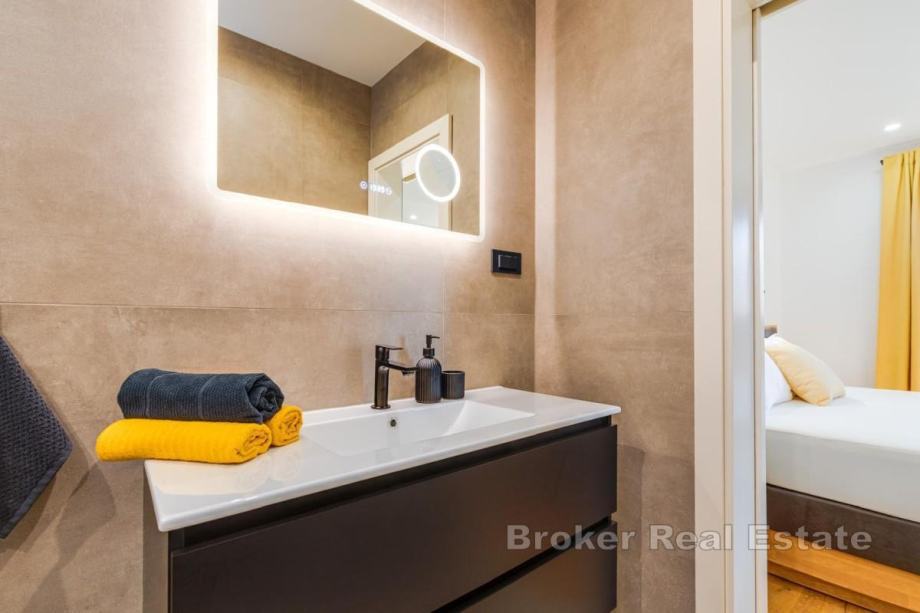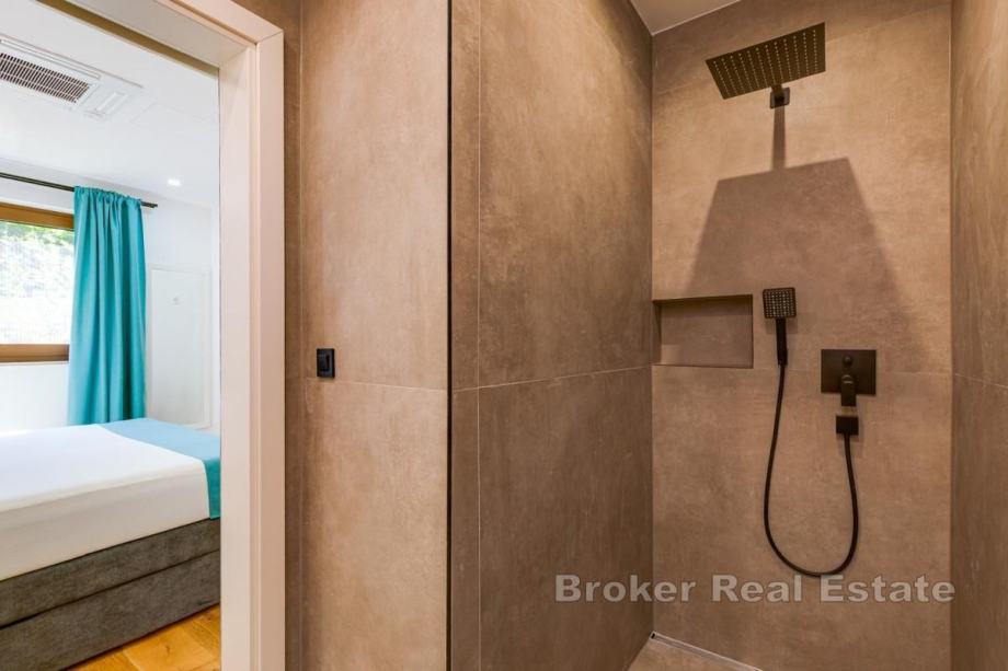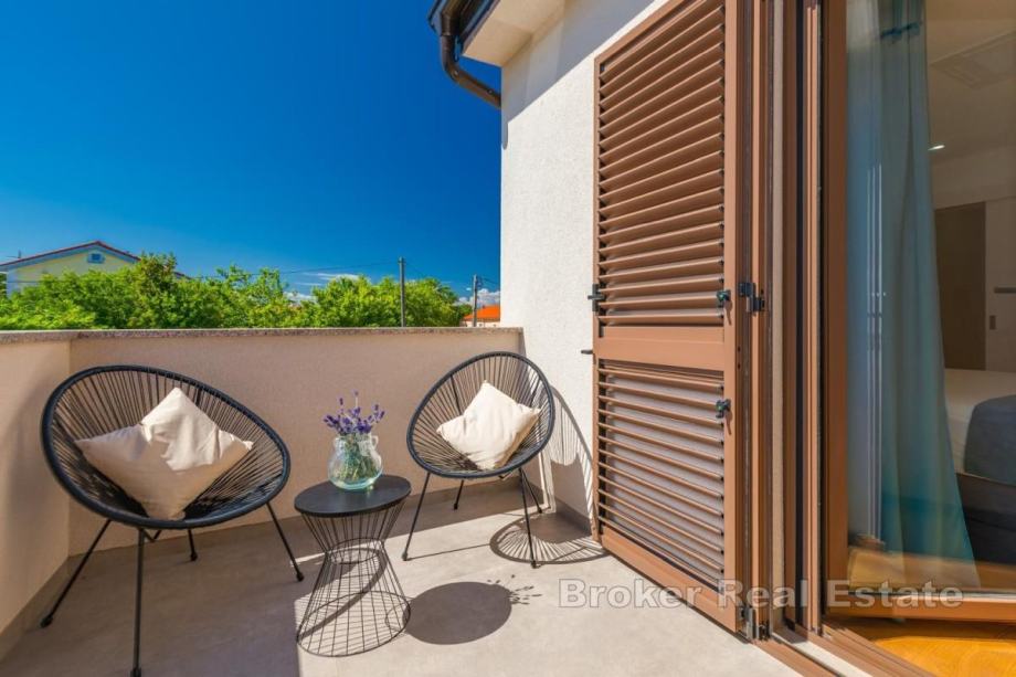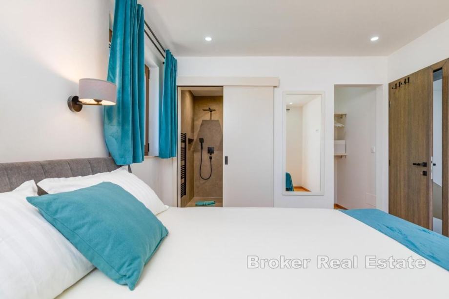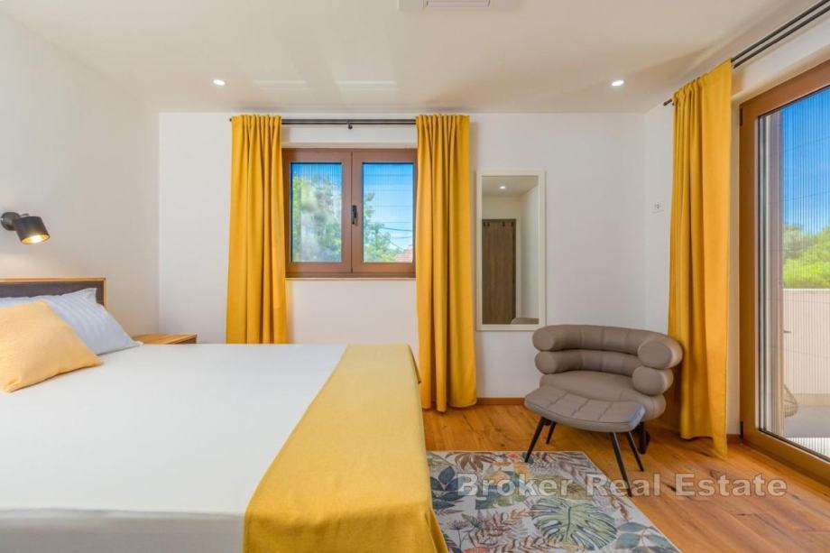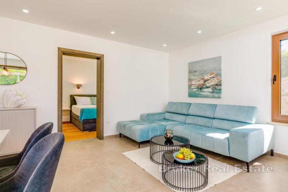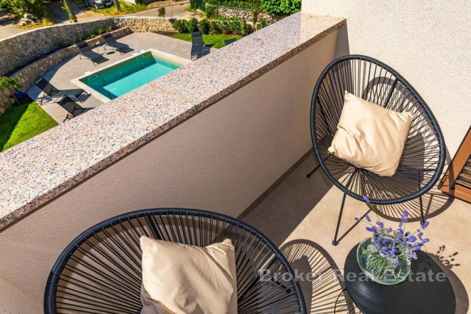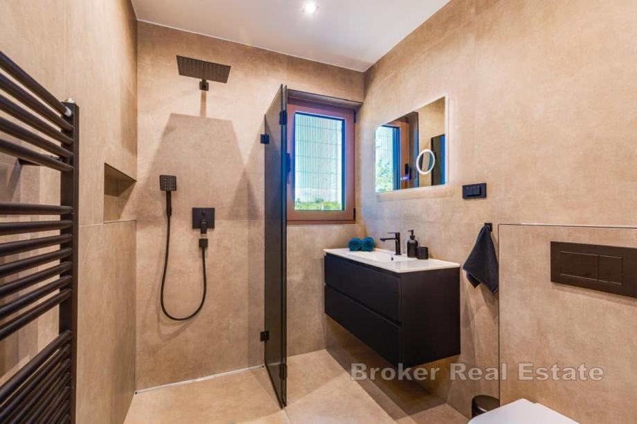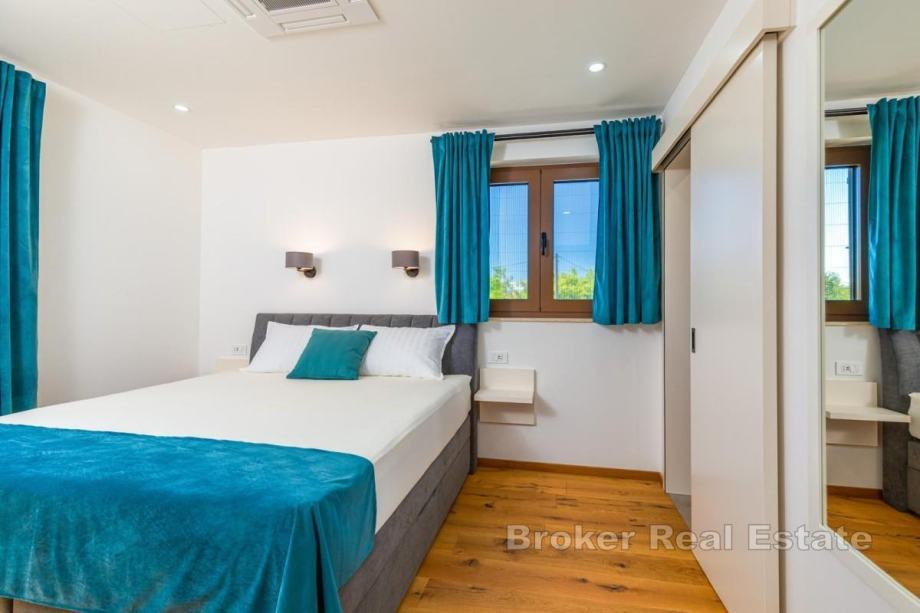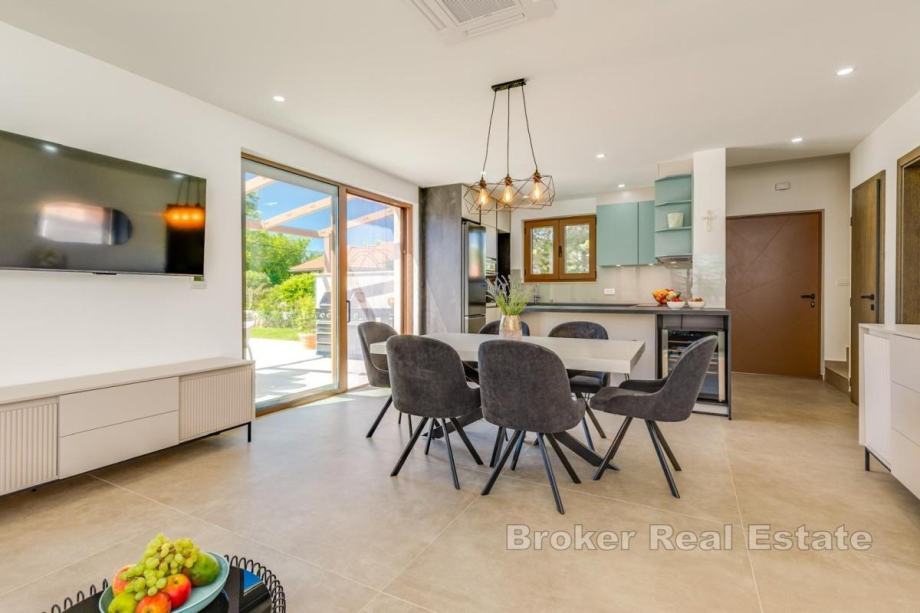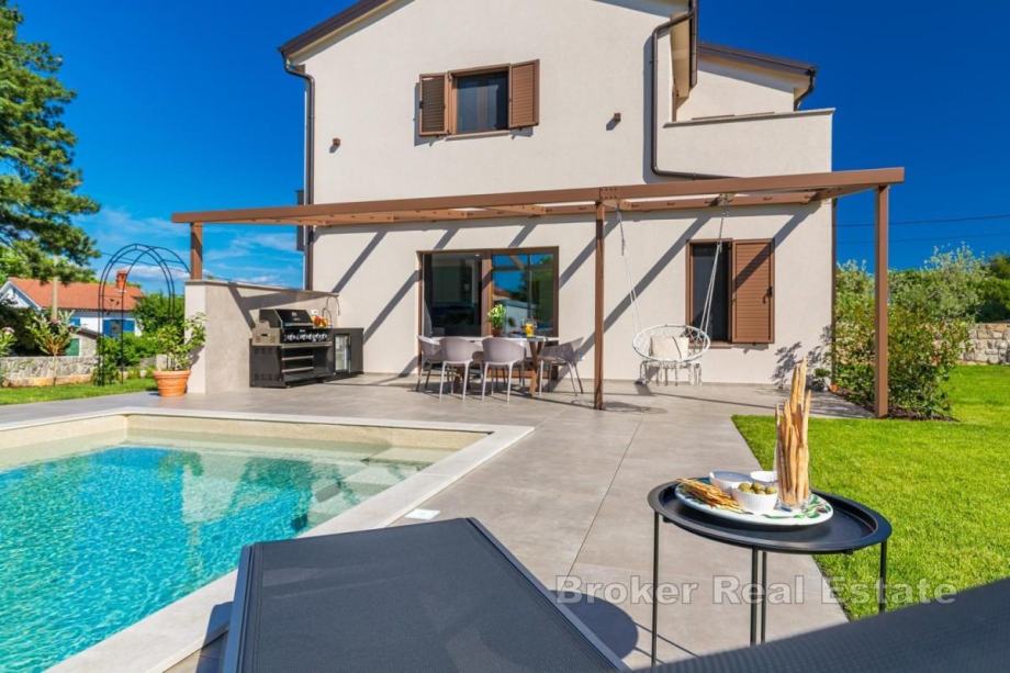 Okućnica je uređena, ima automatsko navodnjavanje, bazen sa sunčalištem, vanjsku kuhinju s roštiljem te prostor za boravak na otvorenom. Kuća se prodaje potpuno namještena novim namještajem. Opremljena je podnim oblogama od keramike i hrastovog parketa, kvalitetnim sanitarijama, multisplit klima uređajima, podnim grijanjem, PVC i ALU troslojnom stolarijom te protuprovalnim vratima. Pripadaju joj dva parkirna mjesta. Udaljenost od plaže i sadržaja iznosi oko 3 km.