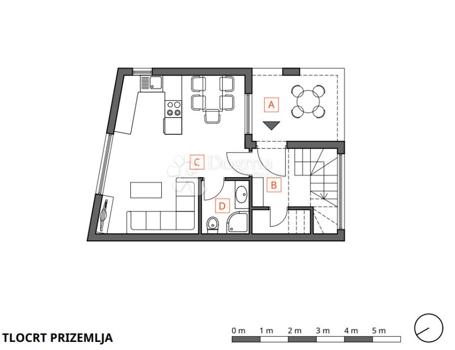 Prizemlje kuće obuhvaća ulazni hodnik, kupaonicu, open space koncept kuhinje s blagovaonicom i dnevnim boravkom, koji imaju izlaz na natkrivenu terasu i dvorište.