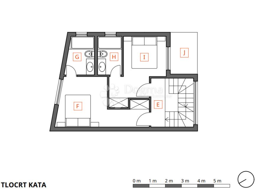 Unutarnje stubište vodi na prvi kat, na kojem su smještene dvije spavaće sobe sa vlastitim kupaonicama, a jedna soba ima i vlastitu terasu.