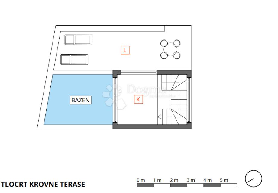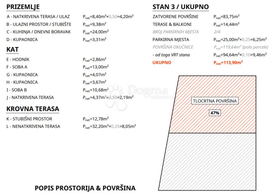 Unutarnji zatvoreni prostor iznosi 83,75 m², dok preostalu površinu čine terase, parkirna mjesta i dvorište.