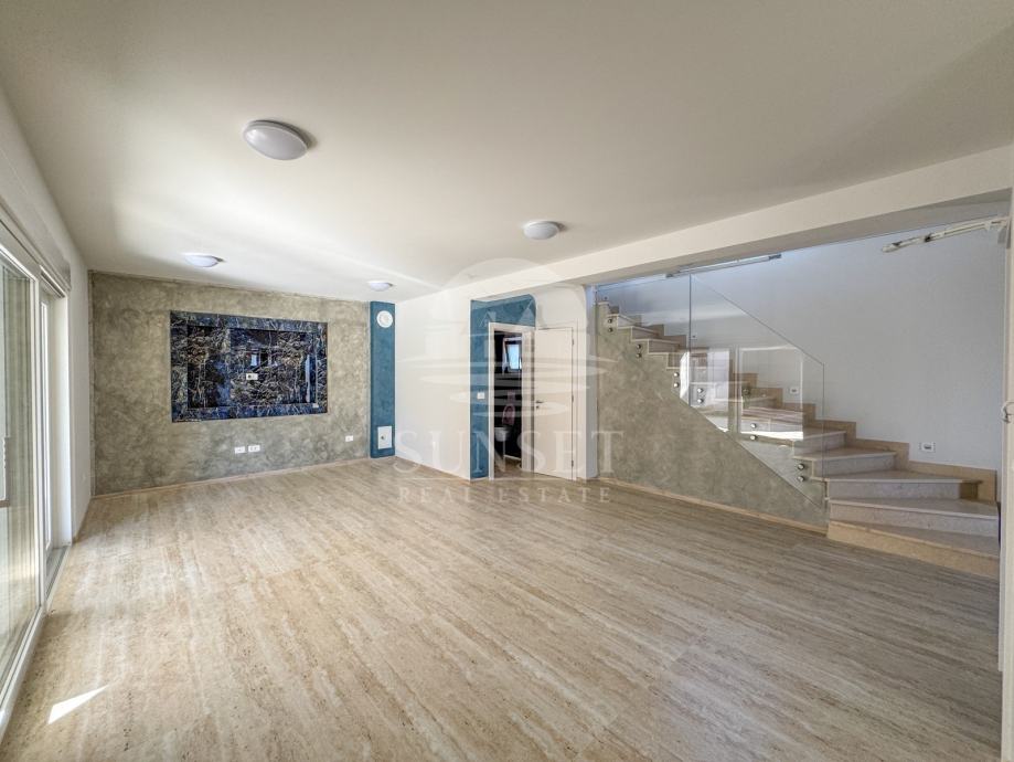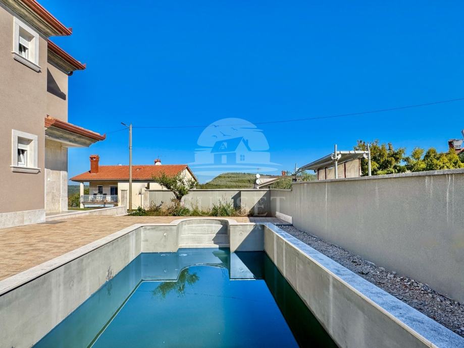 Prodaje se atraktivna kuća s bazenom smještena u okolici Momjana. Kuća ima ukupnu površinu od 173 m2 i prostire se na dvije etaže. U prizemlju se nalazi prostrani dnevni boravak povezan s kuhinjom i blagovaonicom iz koje se izlazi na natkrivenu terasu, zatim kupaonica, spremište i ostava. Na katu su smještene tri spavaće sobe, dvije kupaonice, tehnička soba te velika natkrivena terasa površine 26 m2. Na okućnici od približno 340 m2 nalazi se bazen od 25 m2 sa sunčalištem, pomoćni objekt iste površine i dva parkirna mjesta.