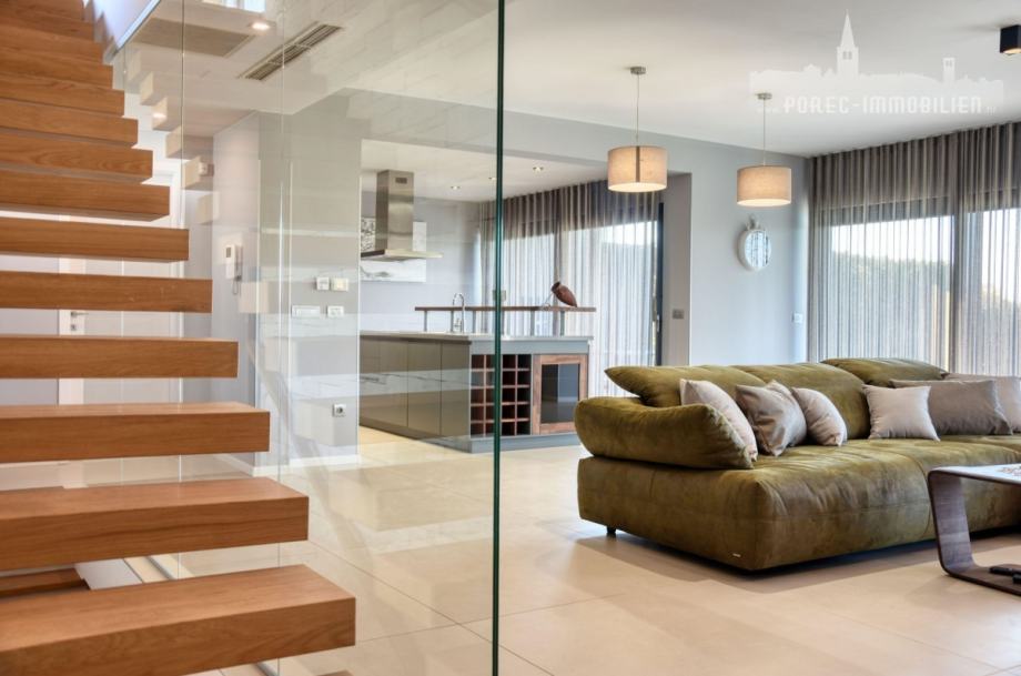 Prizemlje vile sastoji se od otvorenog prostora gdje su smješteni dnevni boravak i kuhinja opremljena sa najkvalitetnijim namještajem i bijelom tehnikom.