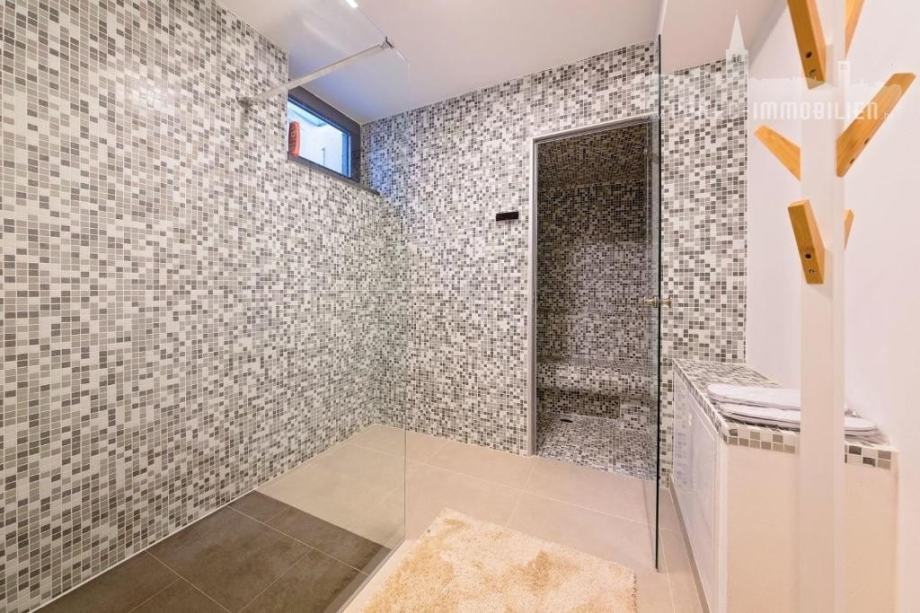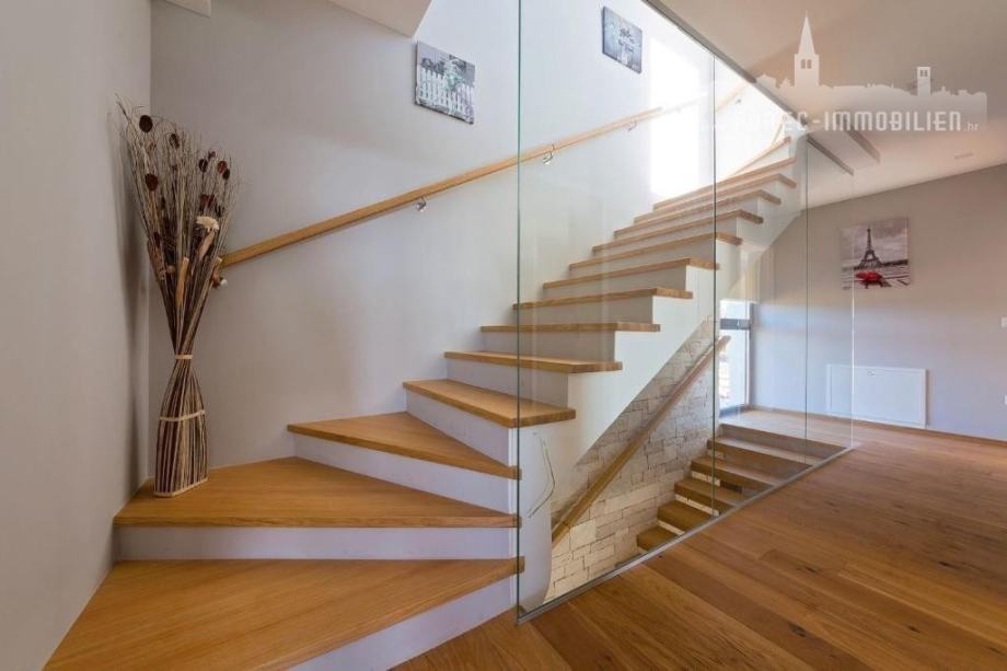 Kroz velike staklene stijene izlazi se na zemljište na kojem je smješten bazen, roštilj, dvije natkrivene terase i sunčalište.