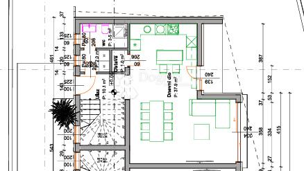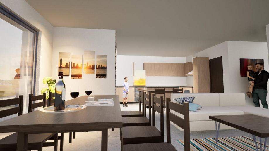 U prizemlju se nalazi impresivan open-space dnevni boravak s kuhinjom i blagovaonicom (38 m²), koji zahvaljujući velikoj staklenoj stijeni prirodno komunicira s vanjskim prostorom. Tu su još ulazni prostor, ostava, gostinjska kupaonica te natkrivena terasa – savršena za opuštanje i druženja.