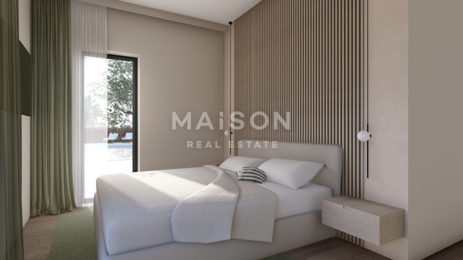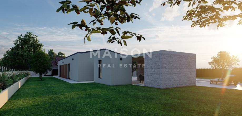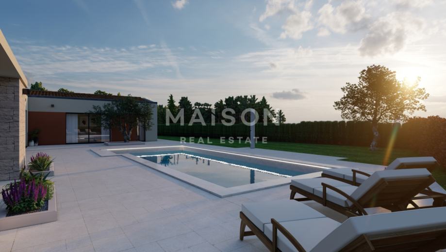Smještena na prostranoj parceli od 1.103 četvorna metra, ova vila oduševljava svojim promišljenim dizajnom i visokim standardima gradnje. Velike staklene stijene protežu se duž glavnog dijela kuće, povezujući interijer s vanjskim prostorom i omogućujući prekrasan pogled na uređeni vrt s bazenom. Ove staklene površine unose obilje prirodnog svjetla i stvaraju neprekidan osjećaj povezanosti s prirodom. U središtu dvorišta nalazi se prostrani bazen dimenzija 11 x 5 metara, okružen sunčalištem i zelenilom, idealnim za opuštanje i uživanje u toplim istarskim danima.
