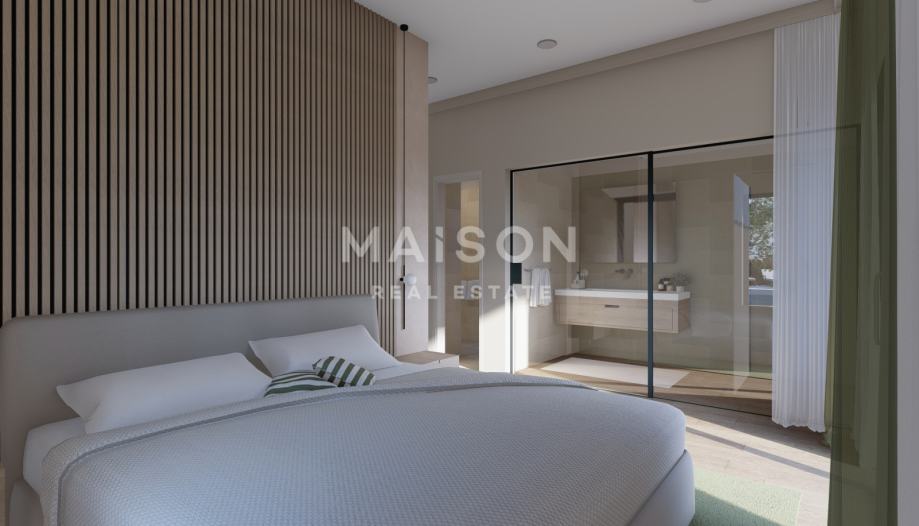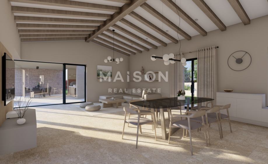 Unutrašnjost vile osmišljena je s naglaskom na luksuz i udobnost. Prostrani dnevni boravak, s visokim stropovima i izloženim drvenim gredama, odiše toplinom i autentičnim stilom, pružajući savršen prostor za obiteljska okupljanja ili opuštanje. Tri elegantno uređene spavaće sobe, svaka s vlastitom kupaonicom, jamče privatnost i udobnost za sve stanare. Talijanska keramika A klase i drveni elementi interijera dodatno naglašavaju profinjenost prostora.
