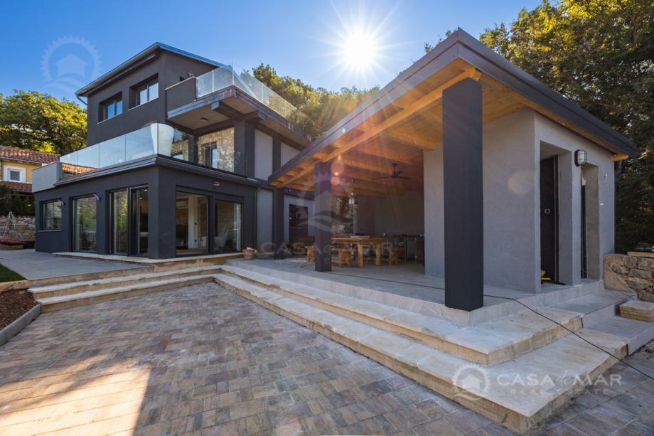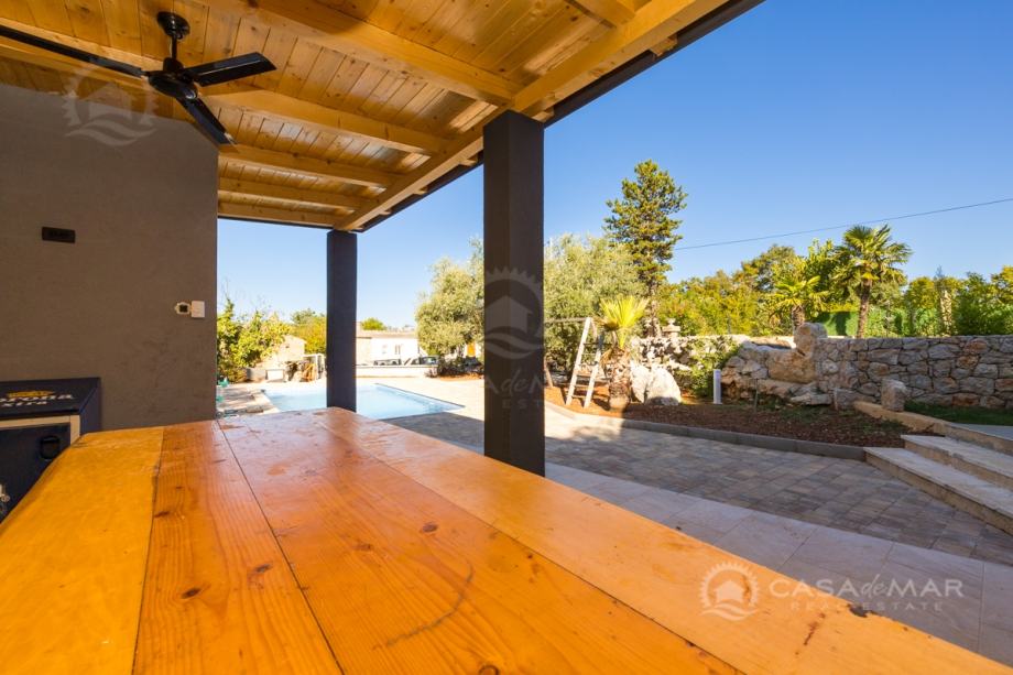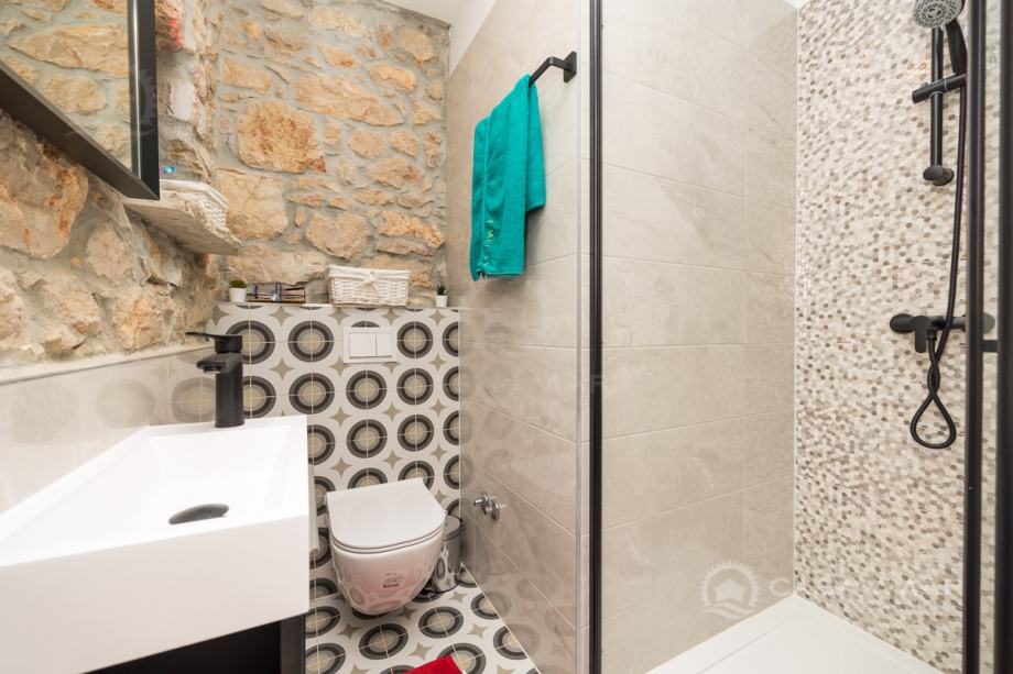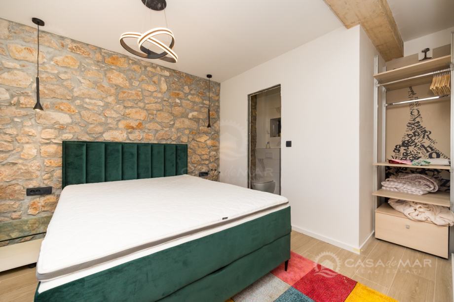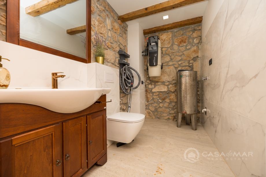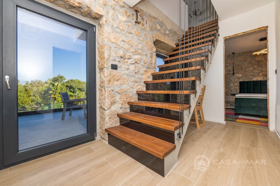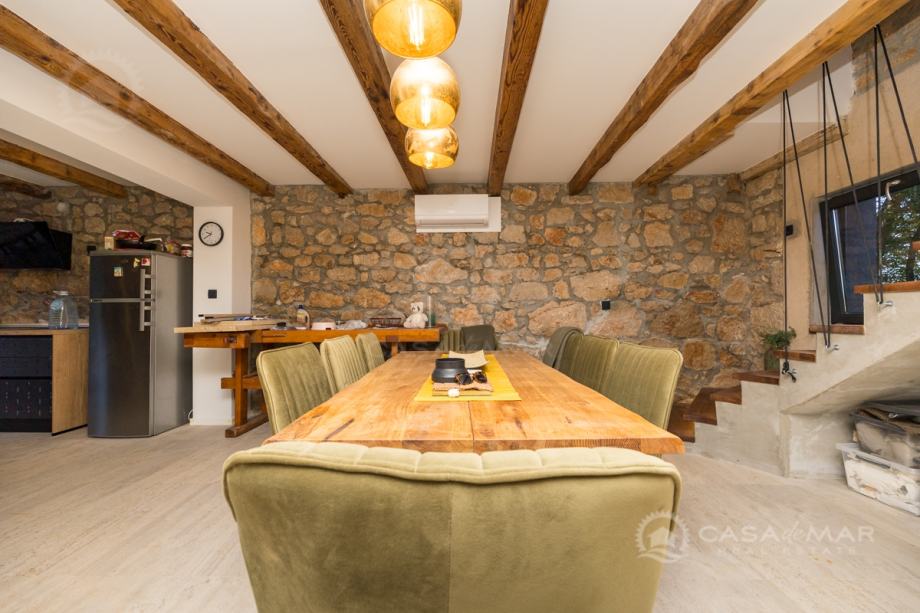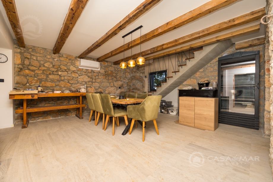Kuća se nalazi trenutno u fazi renovacije, prostire se na 253m2 stambene površine preko tri etaže povezane unutarnjim stepenicama. U prizemlju se nalazi komforan dnevni boravak, kuhinja s blagovaonicom, te jedan toalet. Prvi kat se sastoji od dvije spavaće sobe, dvije kupaonice i terase. Na drugom katu je još jedna prostrana spavaća soba s kupaonicom i terasa. Kuća ima šarmantno uređenu okućnicu na kojoj su smješteni bazen sa sunčalištem i vrtni roštilj.