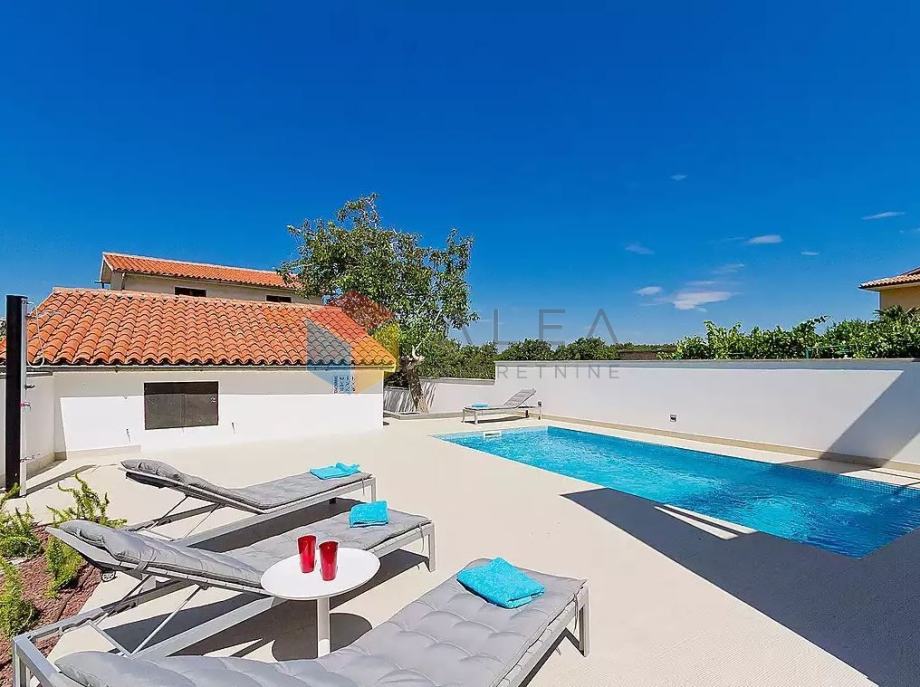 Na uređenoj okućnici nalazi se bazen sa sunčalištem, roštilj te pomoćni objekt.