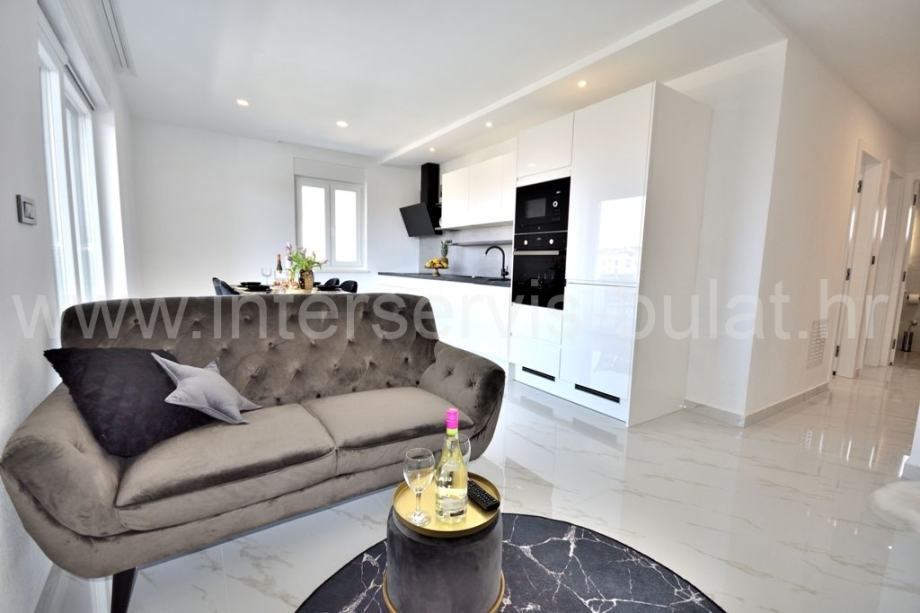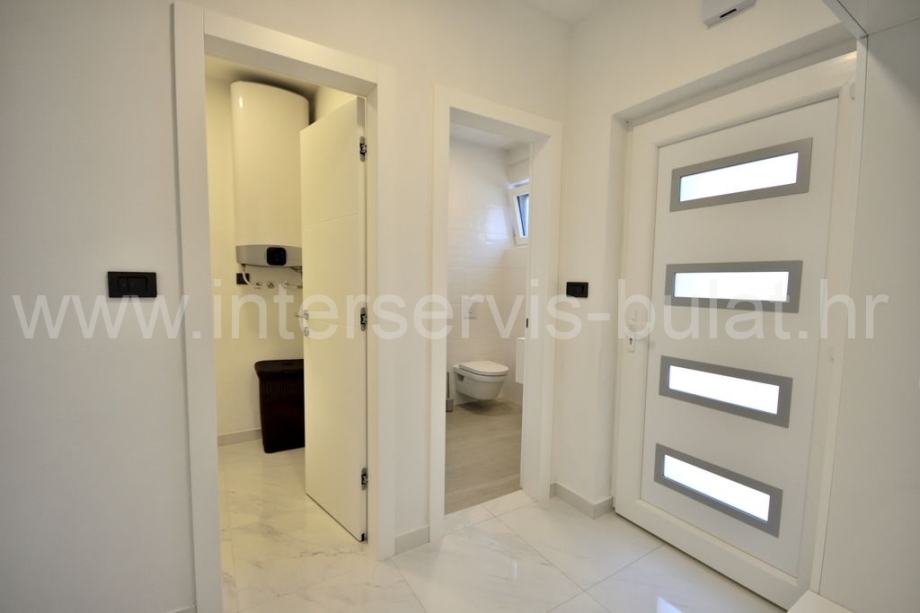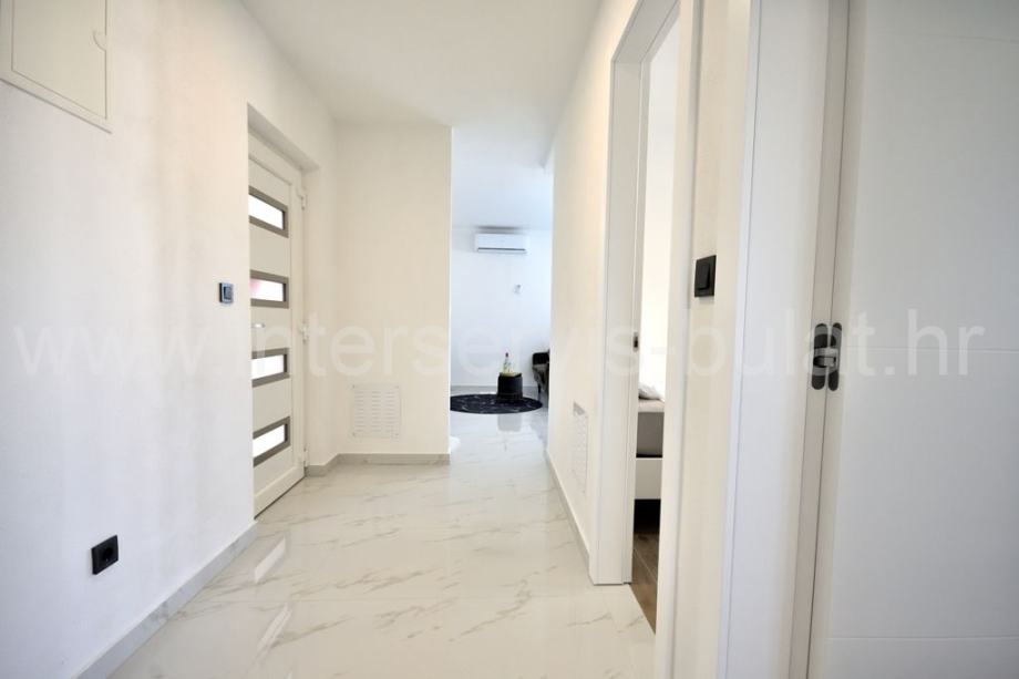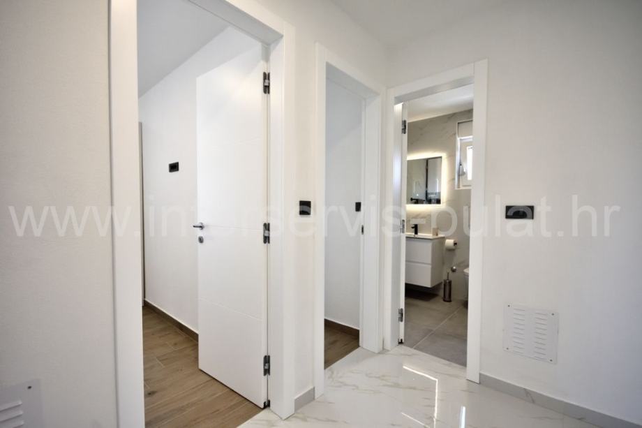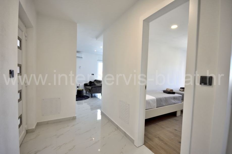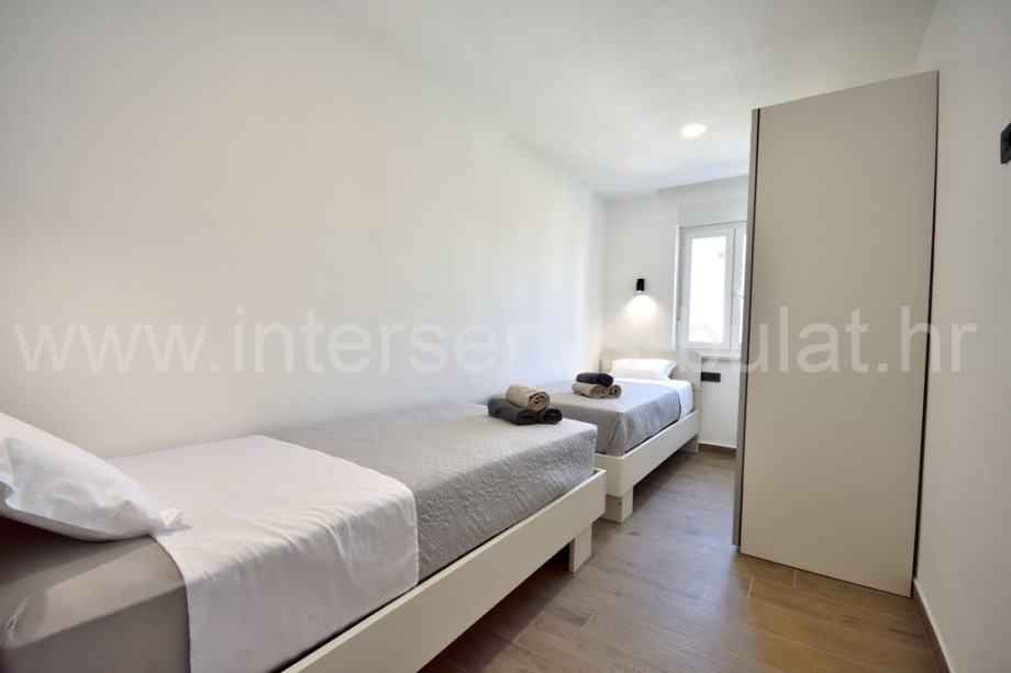 Na katu se nalaze 2 stana jednako luksuzno i moderno opremljena s podnim grijanjem. Stanovi raspolažu s dvije spavaće sobe, kupaonicom, kuhinjom s blagovaonicom i dnevne sobe s izlazom na veliku natkrivenu terasu s lijepim pogledom na bazen (4m x 9m i 1,5 metar dubine) i okućnicu.
