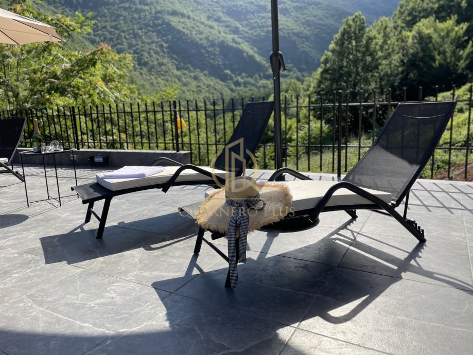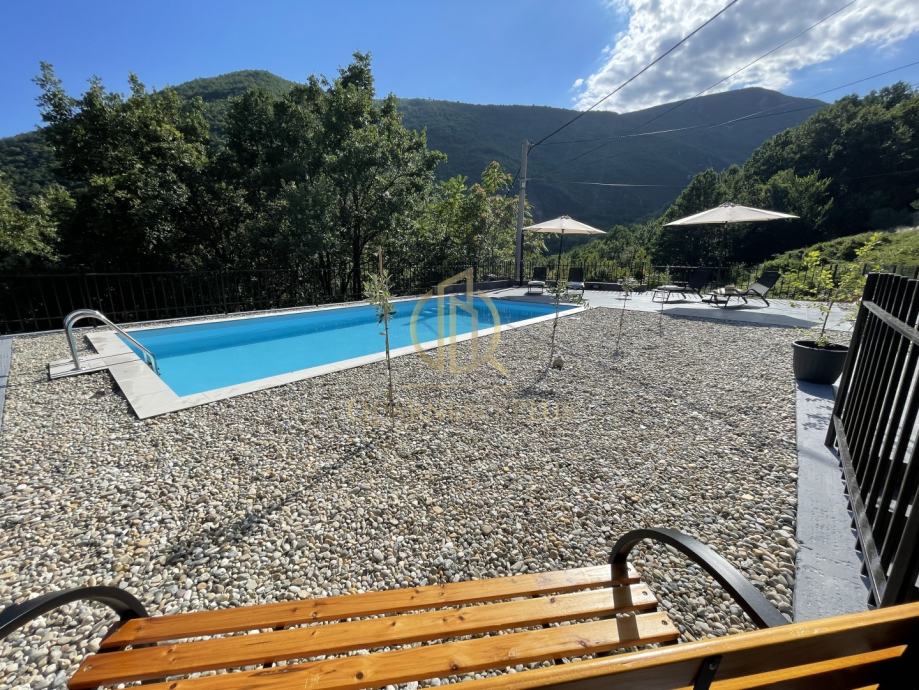 Dovršeni bazen 8x4 sa automatskom pumpom sa kojeg se pruža predivan pogled, sunčalište (50m2), strojarnica/spremište (32m2).