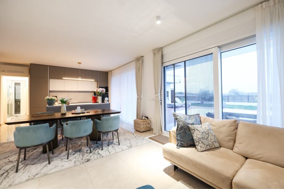 Grijanje se rješava dizalicom topline s podnim grijanjem postavljenim u cijeloj kući. Kuća je opremljena protuprovlanim vratima, video portofonom, električnim roletama, tuš kabinom i jacuzzijem. Kuhinja ima perilicu posuđa. Svaka prostorija osmišljena je s pažnjom na funkcionalnost i moderan dizajn. Kuća pruža pogled na more.
