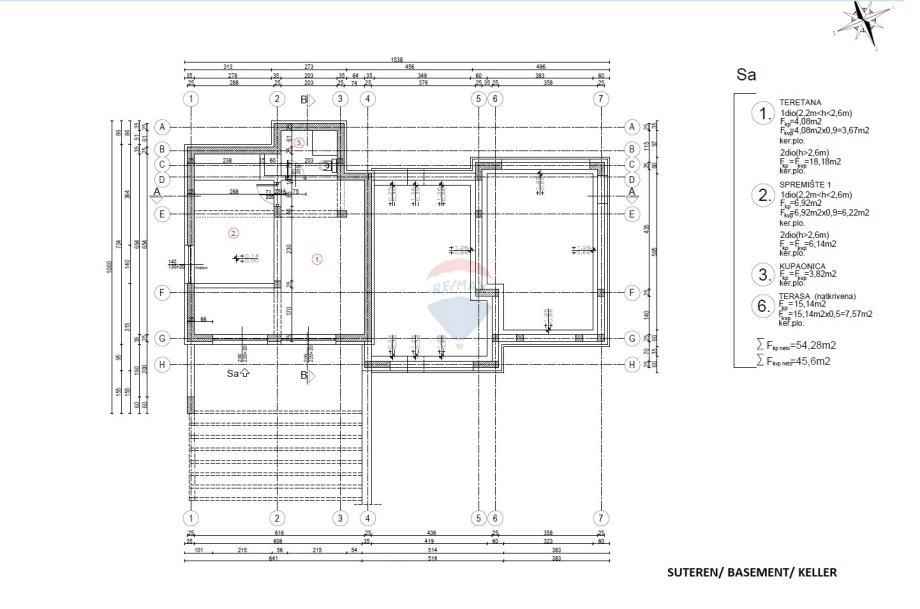 Suteren ukupne korisne vrijednosti površine 45,6m2 sastoji se od teretane, kupaonice, spremišta i natkrivene terase površine 15,14 m2.