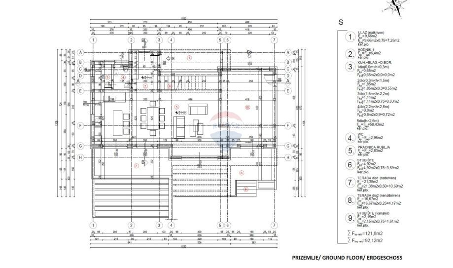 U prizemlju ukupne korisne površine 92,12 m2 nalazi se ulaz, hodnik, wc, praonica rublja, stubište, open space kuhinja s blagovaonicom i dnevni boravak s izlazom na natkrivenu terasu 21,36m2, koja gleda na jug prema moru.