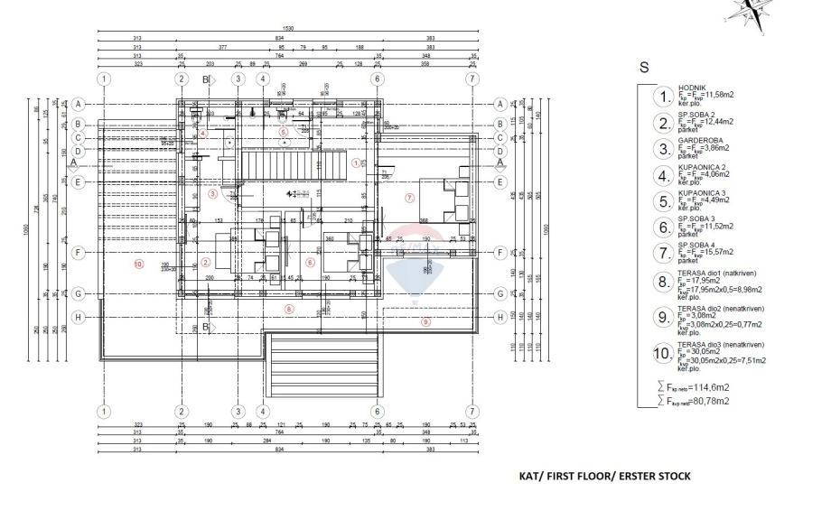 Unutranje stepenice vode do kata korisne površine 80,78 m2, koji se sastoji od hodnika, glavne spavaće sobe s garderobom i zasebnom kupaonicom, 2 spavaće sobe i kupaonice.