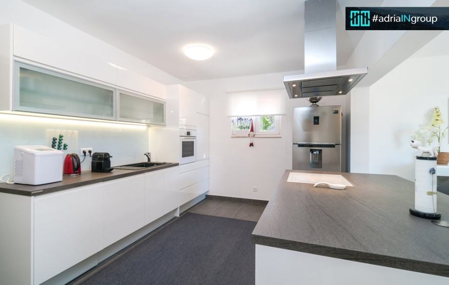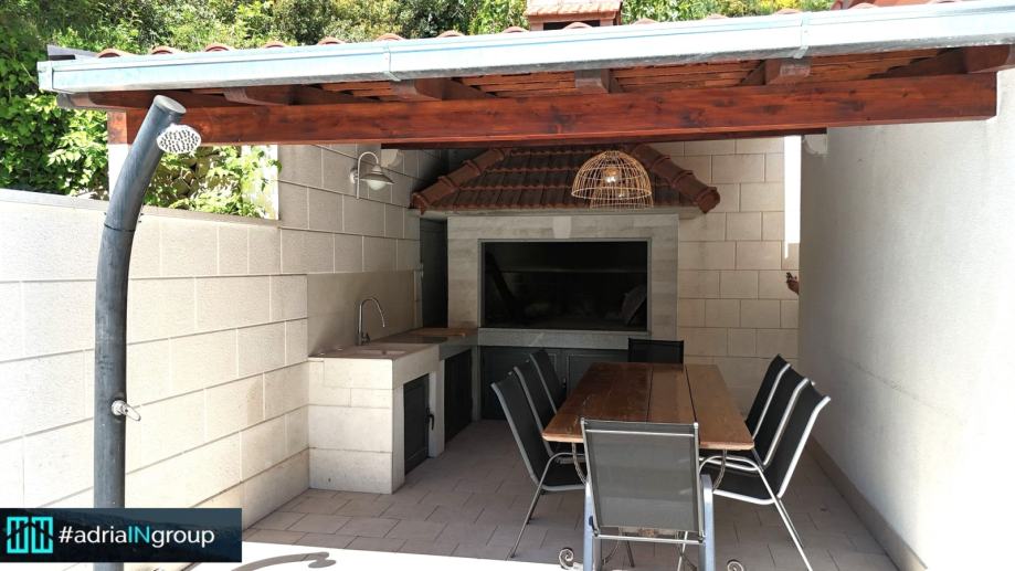 Iz dnevnog boravka izlazi se na veliku terasu s privatnim bazenom, sunčalištem i vanjskim natkrivenim kaminom – idealno za uživanje tijekom cijele godine.