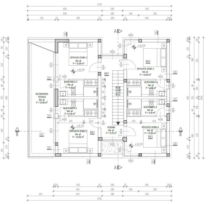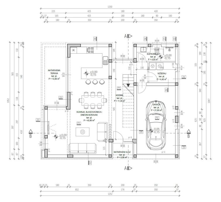 Kuću čine prizemlje i prvi kat. Raspored prostorija u prizemlju čine hodnik, praonica, kupaonica, kuhinja s blagovaonicom i dnevnim boravkom, natkrivena terasa te garaža. Unutarnje stepenice vode na prvi kat gdje se nalazi hodnik, 4 spavaće sobe svaka s kupaonicom te dijelom natkrivena terasa.