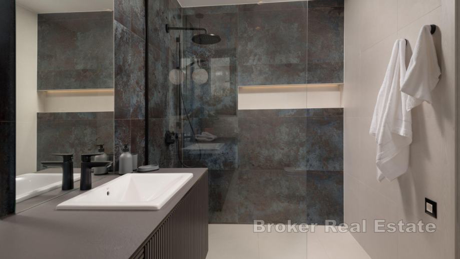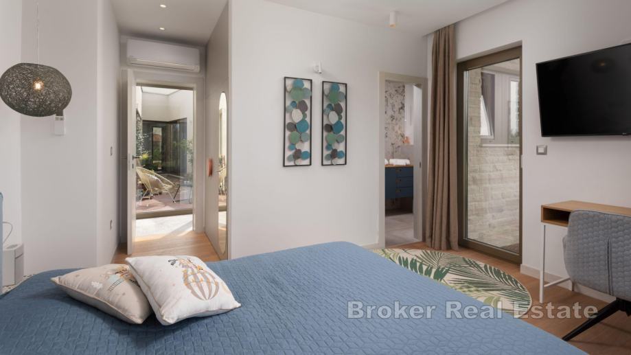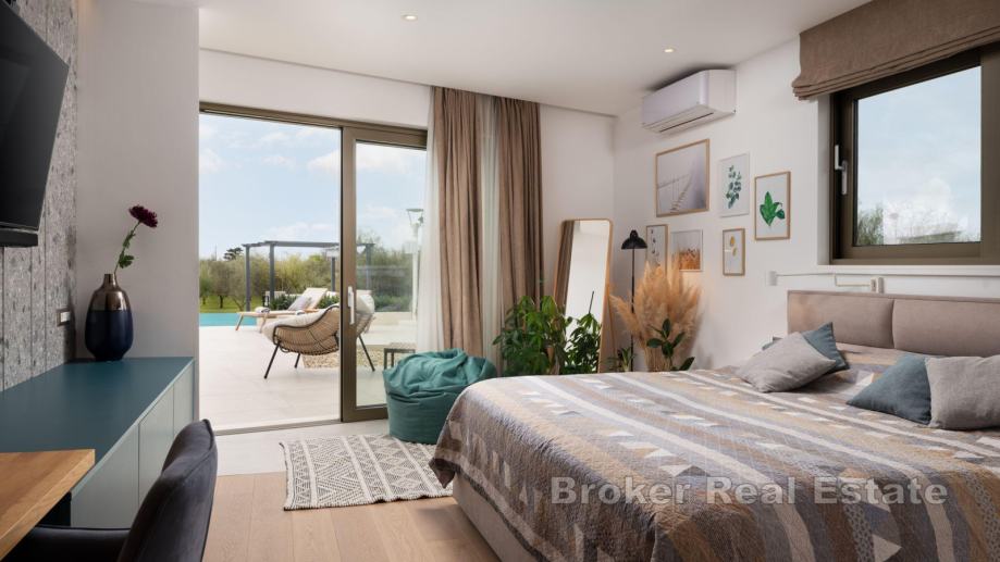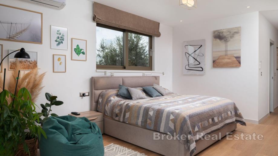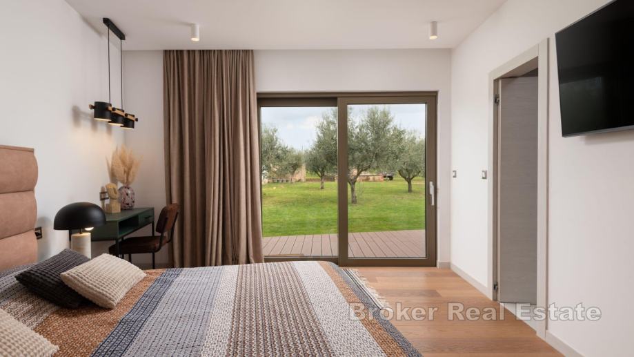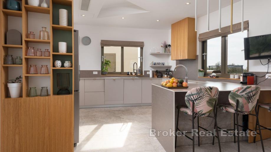 Na zemljištu se nalazi glavna kuća sa pomoćnim objektom. Glavna kuća se sastoji od otvorenog koncepta kuhinje s blagovaonicom i dnevnim boravkom, četiri spavaće sobe sa pripadajućim kupaonicama, toalet i vešeraj. U središnjem dijelu glavne kuće nalazi se vanjski vrt s garniturom, što ga čini savršenim mjestom za mir i opuštanje. U pomoćnom objektu je jedna spavaća soba, kupaonica i komin na drva. Iz dnevnog prostora omogućen izlaz na natkrivenu terasu koja je obogaćena vanjskom blagovaonicom i bazenom (11 x 5 m) sa sunčalištem.