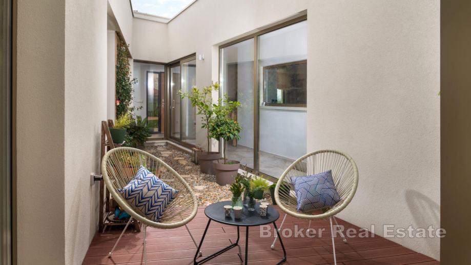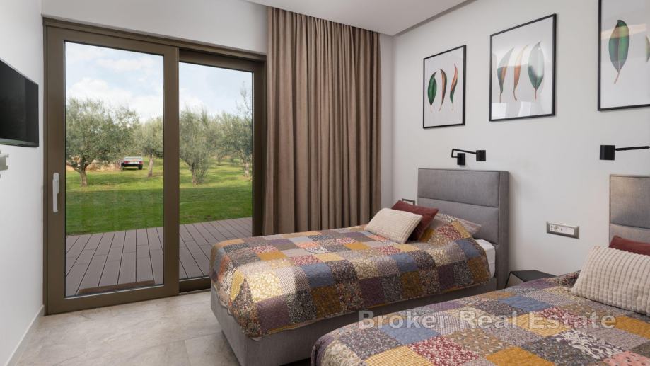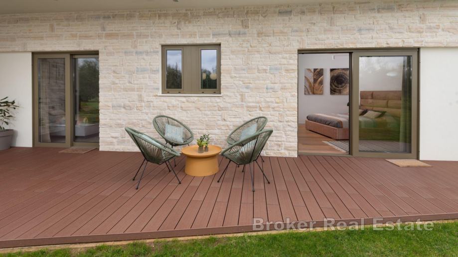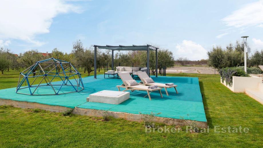 Na uređenoj okućnici se nalazi dječje igralište i 40-ak stabala maslina te posjeduje dvije garaže.