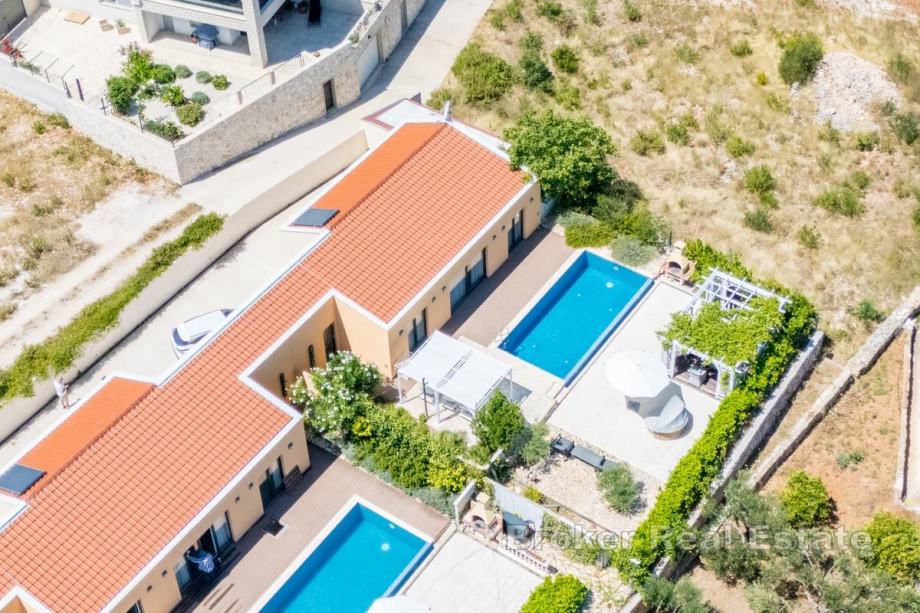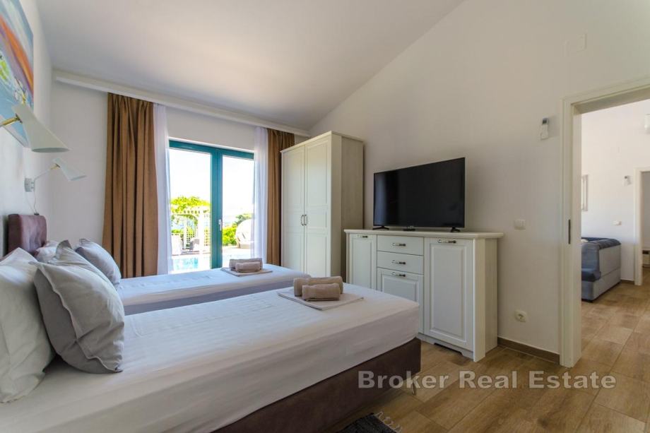 Kuća se sastoji od dvije spavaće sobe, svaka sa svojom privatnom kupaonicom, prostranog dnevnog boravka te kuhinje s blagovaonicom. Iz svake prostorije omogućen je izlaz na veliku terasu koja predstavlja pravu oazu za opuštanje; tu se nalazi grijani bazen, vanjski prostor za blagovanje te sunčalište za uživanje u toplim danima.