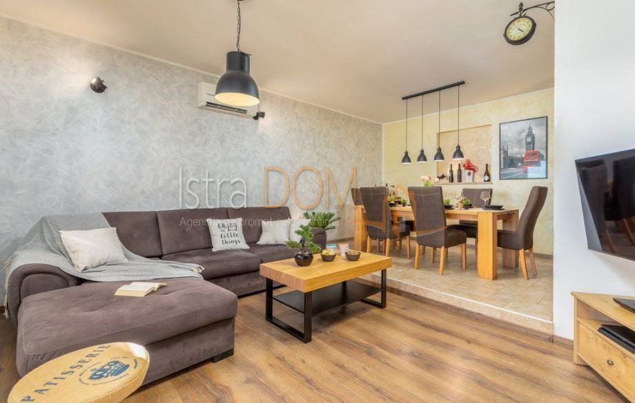 Kuća je koncipirana na način da se prizemlje sastoji od prostranog prostora u kojem je smještena blagovaonica, novoopremljena kuhinja, spremište, kupaonica i prostrana ljetna terasa.