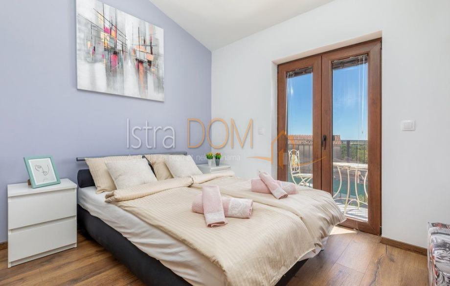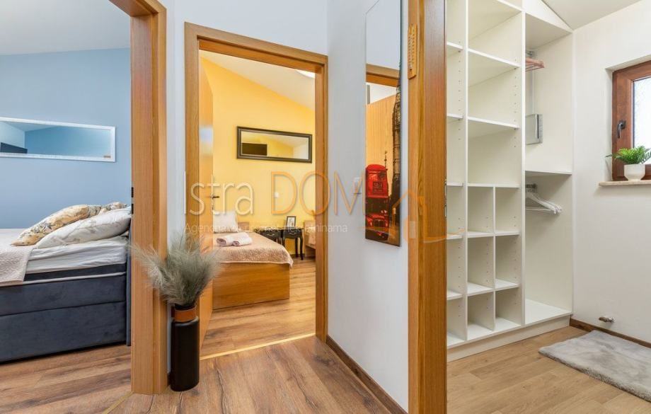 Na prvom katu istaknute kuće nalazi se hodnik, kupatilo i tri spavaće sobe od kojih jedna ima izlaz na terasu sa koje seže otvoreni pogled na prekrasno dvorište s bazenom i zelenilo. Okućnica je u potpunosti ograđena te se sastoji od bazena površine 30 m2, vanjskog tuša, sunčališta, uređene zelene površine i izdvojenog parkirališta u kojem se komotno mogu parkirati četiri automobila.