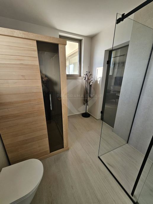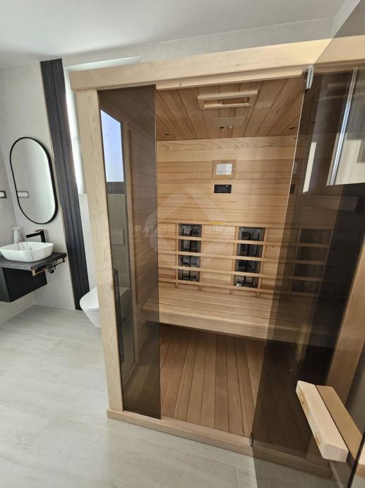 Kuća se sastoji od 4 prostrane spavaće sobe, svaka s vlastitom kupaonicom, garderobe, saune za potpuno opuštanje te prekrasne terase za uživanje na otvorenom. Dodatno, na parceli se nalazi bazen površine 25 m2 i uređeni vrt od 551 m2 koji pruža potpunu privatnost i mir.