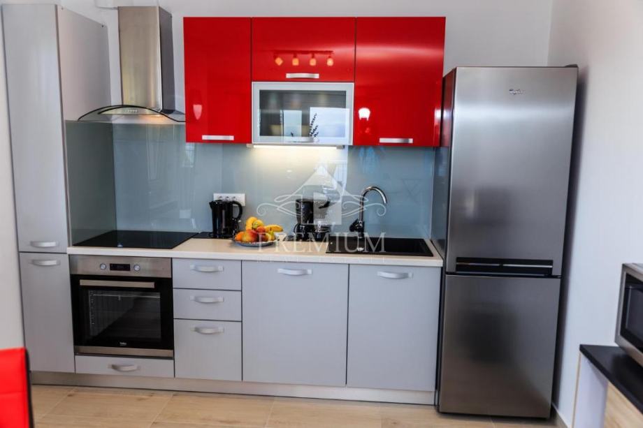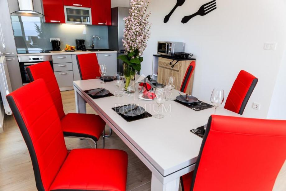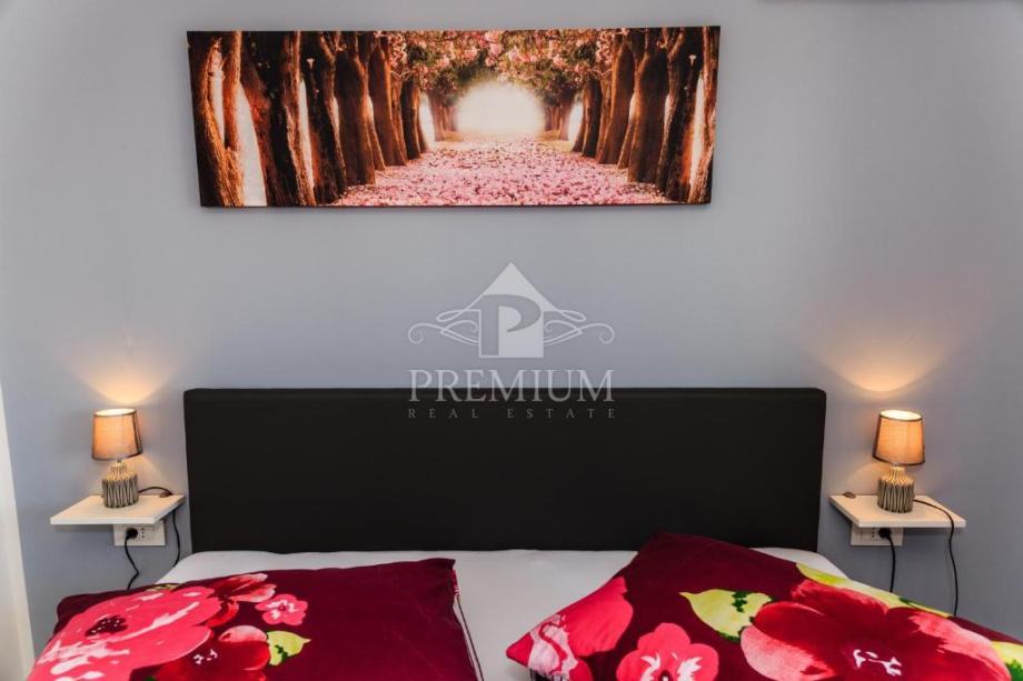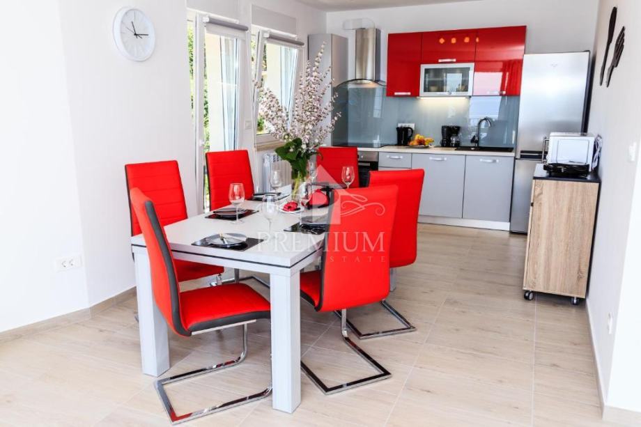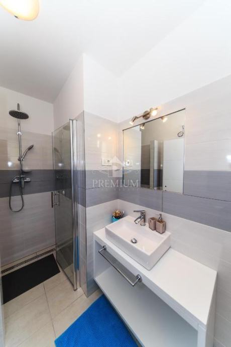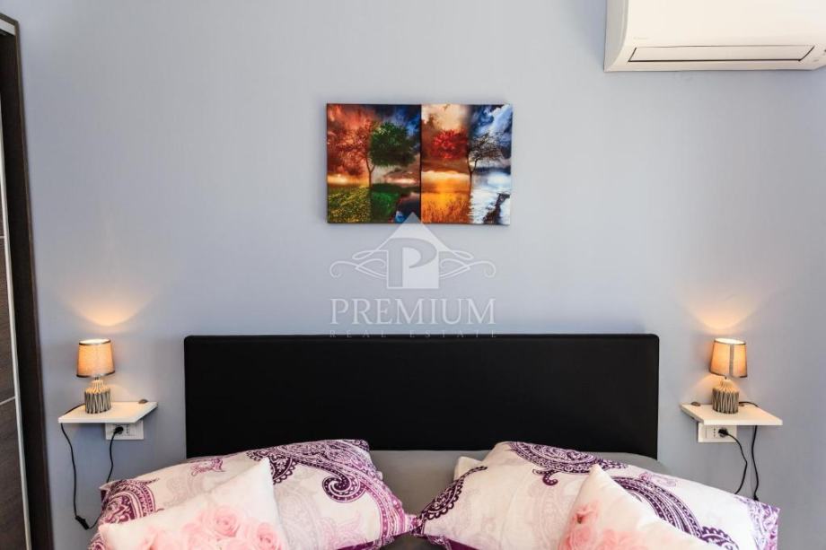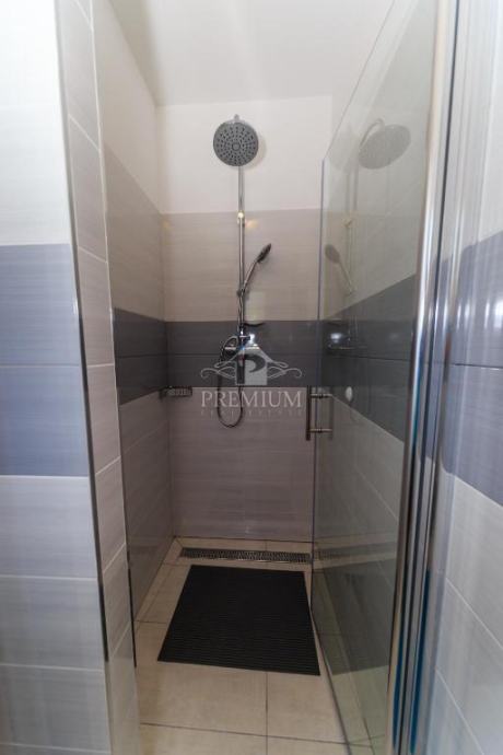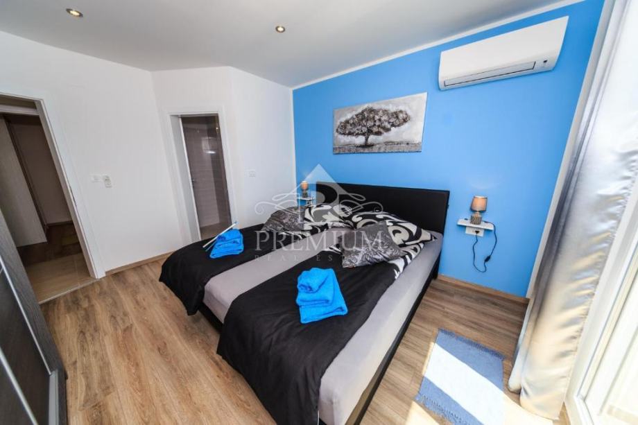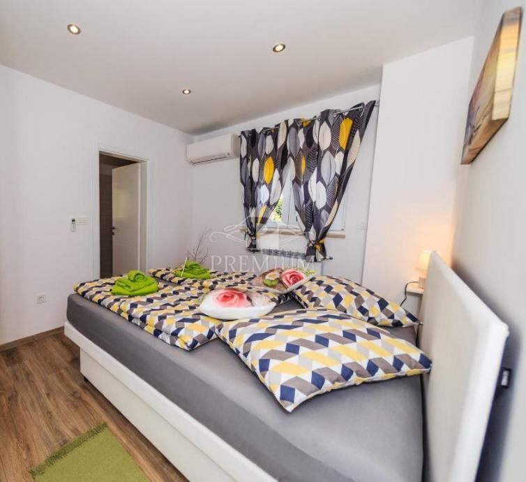 Kuća se sastoji od 2 veća stana / aparrtmana svaki po 110 m2 sa unutarnjim stubištem i prolazom do dvije garaže. Svaki stan ima po tri spavaće sobe od kojih su dvije sa vlastitom kupaonicom. Tu je još moderno opremljena kuhinja te dnevni prostor iz kojega izlazimo na balkon sa kojeg se pruža predivan pogled na more.