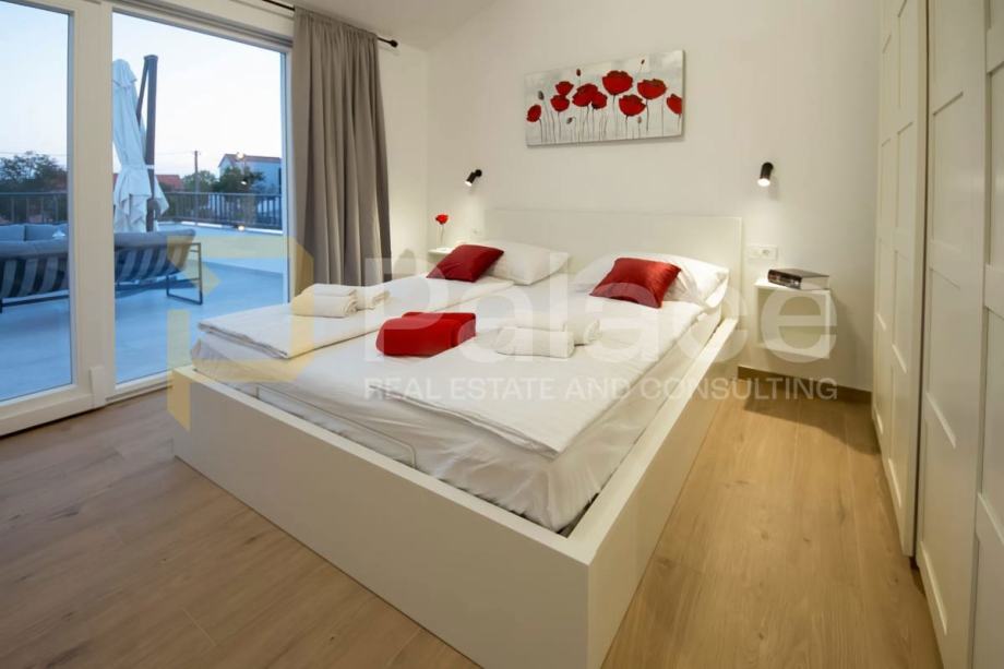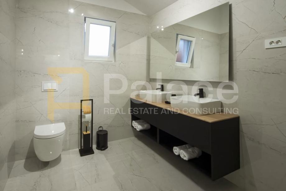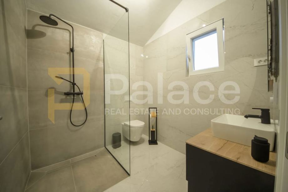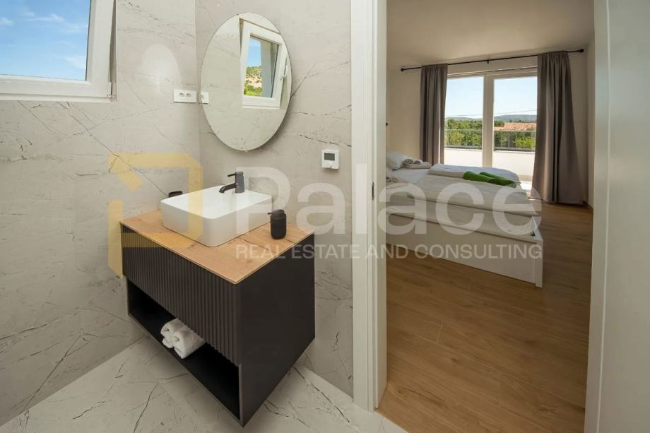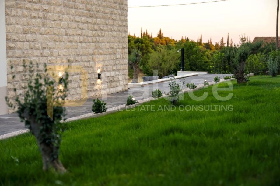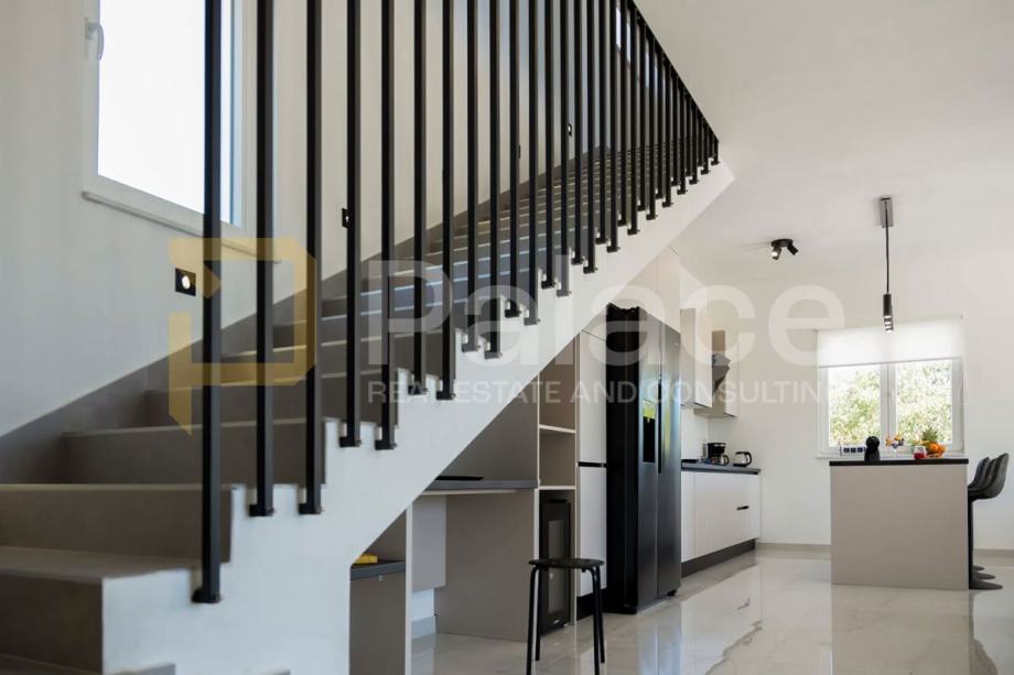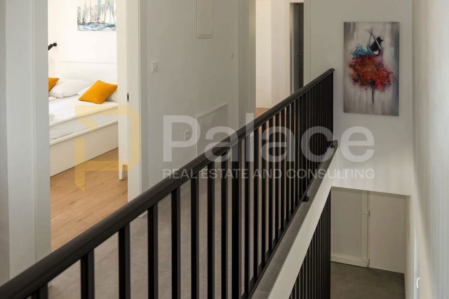 Stepenice vas vode na prvi kat kuće gdje su se smjestile ukupno tri sobe, a svaka ima svoju kupaonicu te su sve sobe klimatizirane. Kroz hodnik se proteže ugradbeni ormar, kao idealno rješenje za praktično odlaganje svih vaših stvari. Koristili su se samo najbolji materijali za gradnju te se pazilo na svaki detalj. Kroz cijelu kuću je provedeno i podno grijanje. Okućnica je potpuno uređena, zasađene su i mediteranske biljke, te je i napravljeno igralište za djecu. Velika parcela osigurava mir i privatnost, kao i mogućnost parkinga za nekoliko automobila.