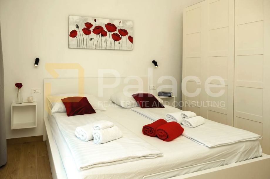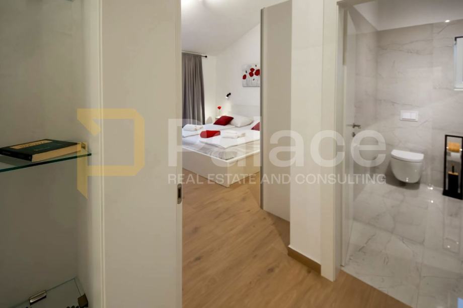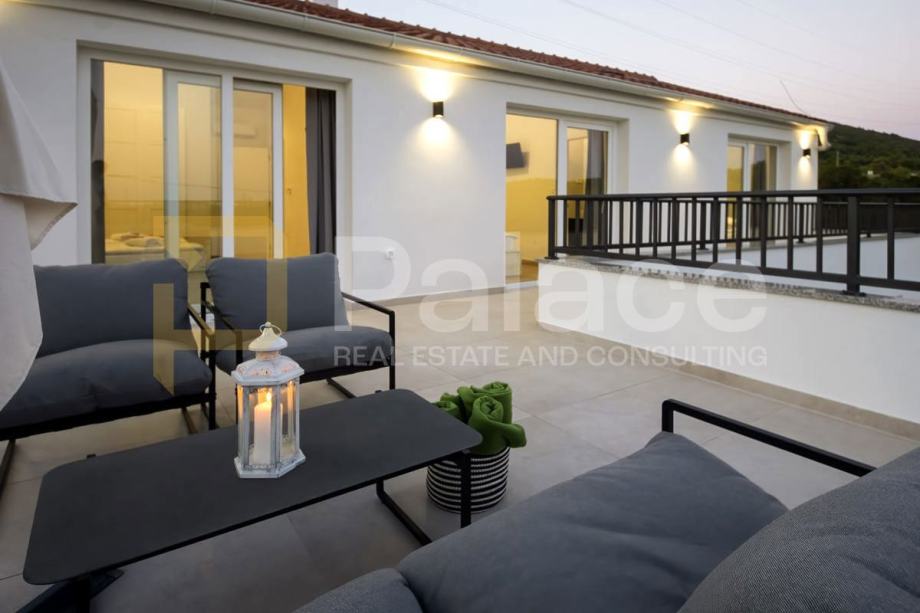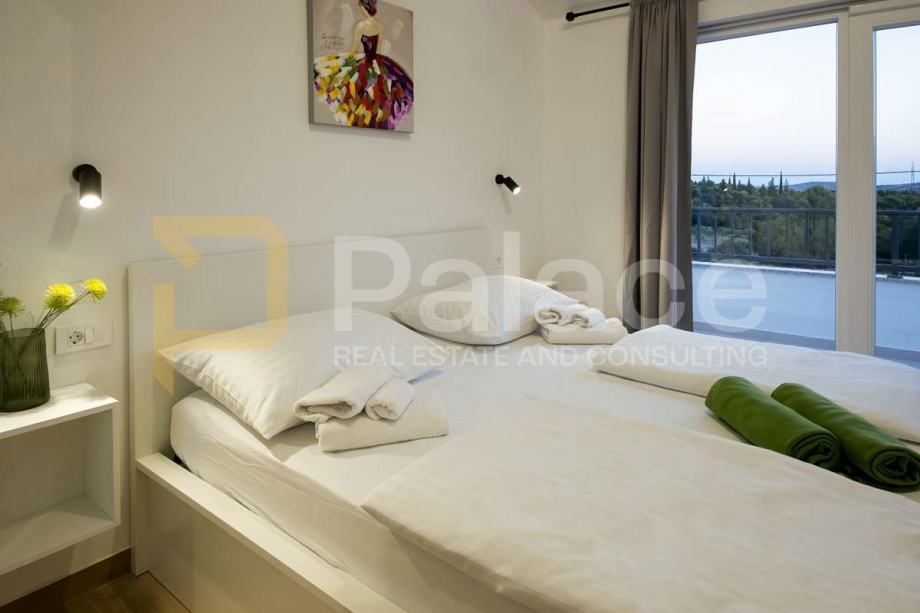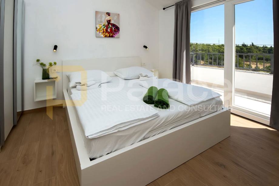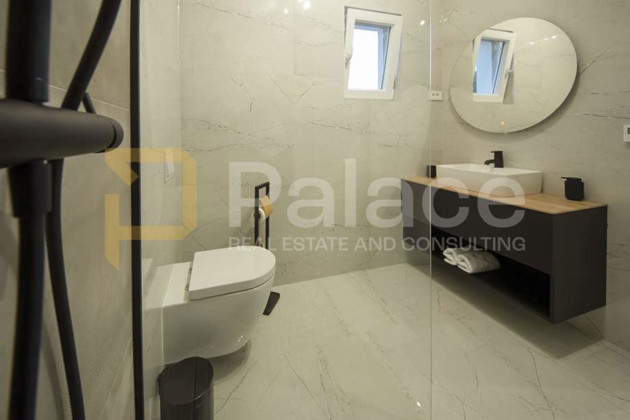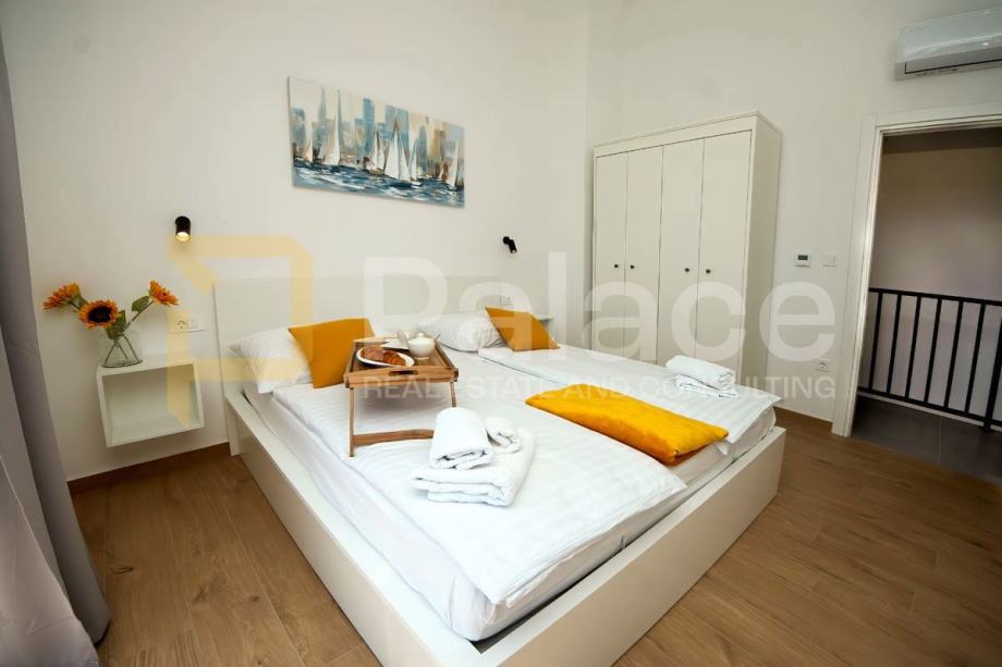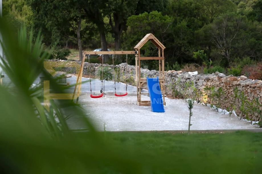 Stepenice vas vode na prvi kat kuće gdje su se smjestile ukupno tri sobe, a svaka ima svoju kupaonicu te su sve sobe klimatizirane. Kroz hodnik se proteže ugradbeni ormar, kao idealno rješenje za praktično odlaganje svih vaših stvari. Koristili su se samo najbolji materijali za gradnju te se pazilo na svaki detalj. Kroz cijelu kuću je provedeno i podno grijanje. Okućnica je potpuno uređena, zasađene su i mediteranske biljke, te je i napravljeno igralište za djecu. Velika parcela osigurava mir i privatnost, kao i mogućnost parkinga za nekoliko automobila.