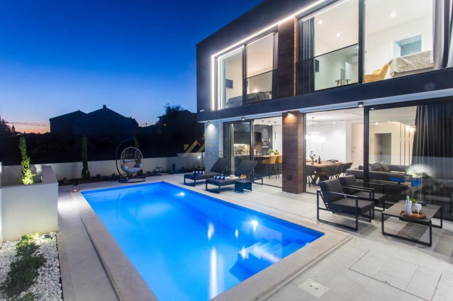 Kaštel Kambelovac, iznajmljuje se luksuzna kuća suvremene arhitekture organizirana na dvije etaže, ukupne stambene površine 170m2 s terasom od 100m2 i dvorištem od 300m2.