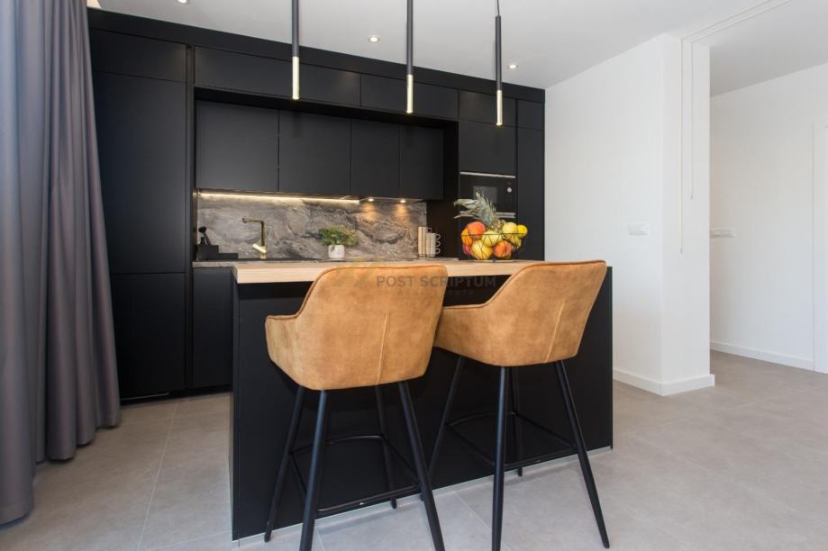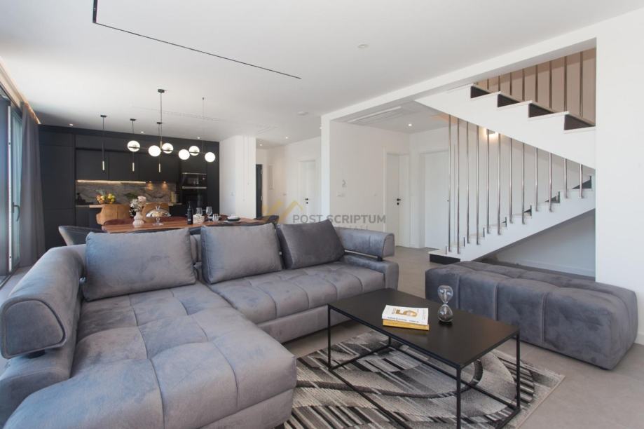 Kuća je opremljena modernim i kvalitetnim namještajem, sve prostorije su klimatizirane, a u uređenju su preferirane nijanse bijele, sive i crne boje sa zlatnim detaljima kojima je osiguran luksuzan i profinjen interijer.