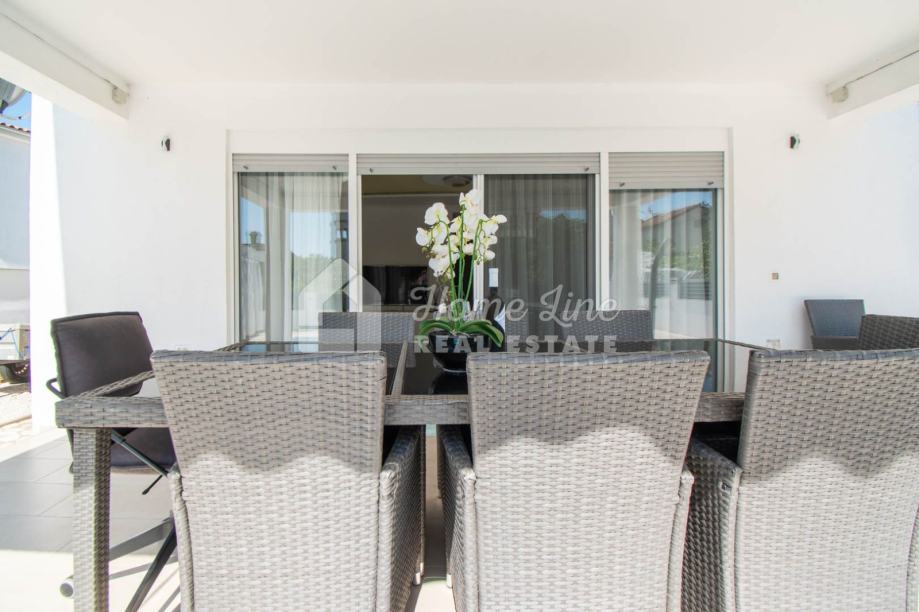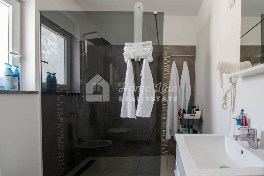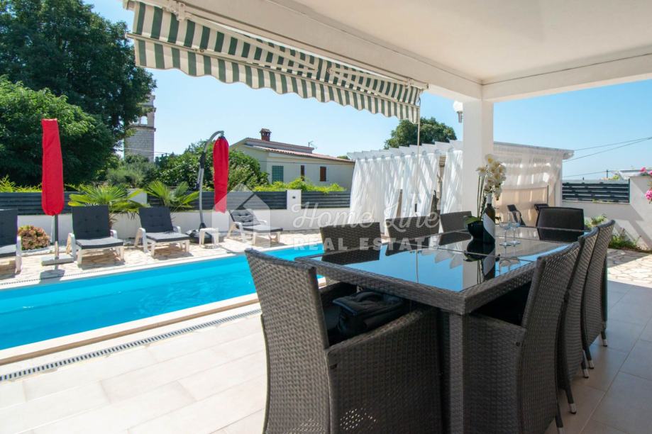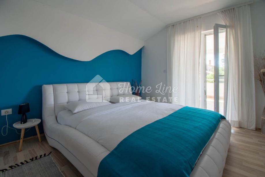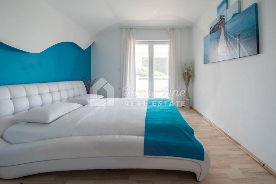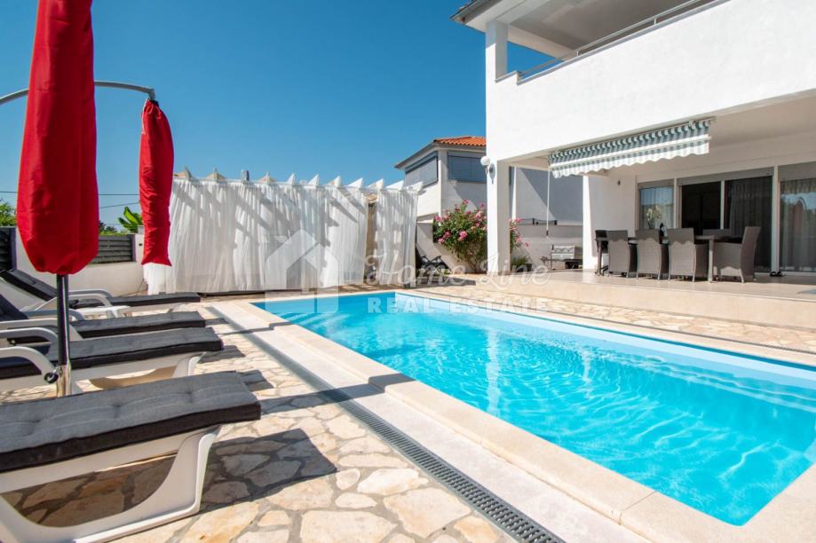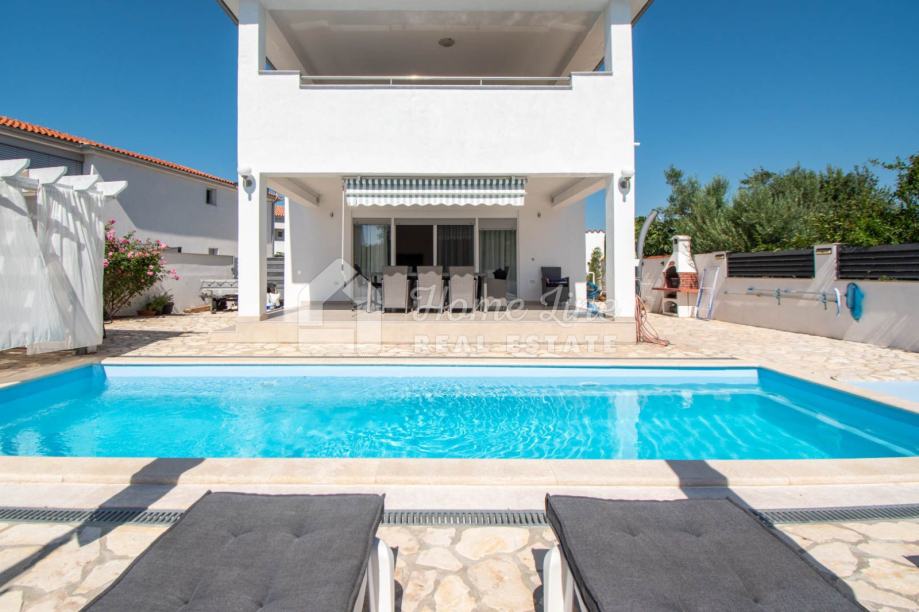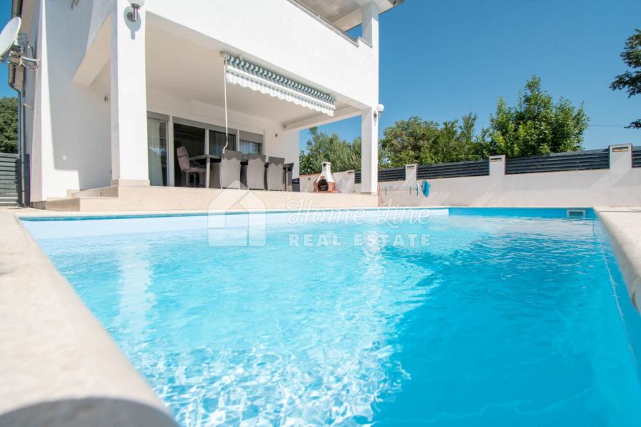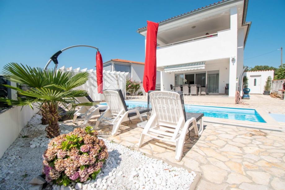 Prodaje se moderna kuća s bazenom na mirnoj lokaciji u Krnici. Izgrađena je 2015. godine na parceli površine 426 m2 sa bazenom površine 21 m2, jacuzzijem i vrtnom kućicom. Sastoji se od prizemlja i kata ukupne površine 163 m2. Prizemlje čini stan koji se sastoji od dvije spavaće sobe, kupaonice, kuhinje i dnevnog boravka sa izlazom na prostranu natkrivenu terasu. Unutarnje stepenice vode na kat na kojemu je smješten stan kojega čine dvije spavaće sobe, kupaonica, kuhinja i dnevni boravak te prostrana natkrivena terasa. Kuća se kompletno namještena i opremljena te se kao takva prodaje. Grijanje/hlađenje izvedeno je sa inverter klima uređajima i peći na kruta goriva. Okućnica je ograđena zidom, uređena te ima osigurana dva parkirna mjesta. nalazi se na mirnoj lokaciji udaljenoj 200 metara od svih potrebnih sadržaja te 3 km od plaže.