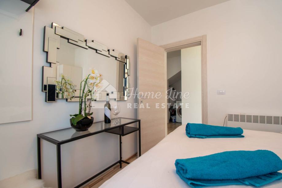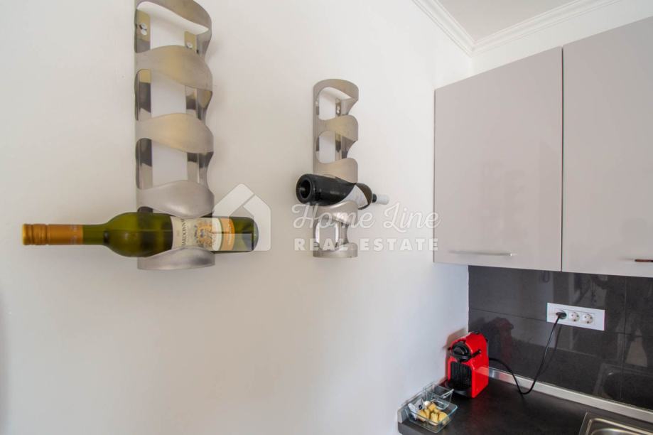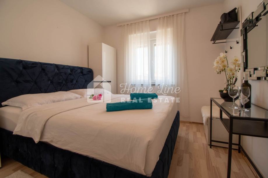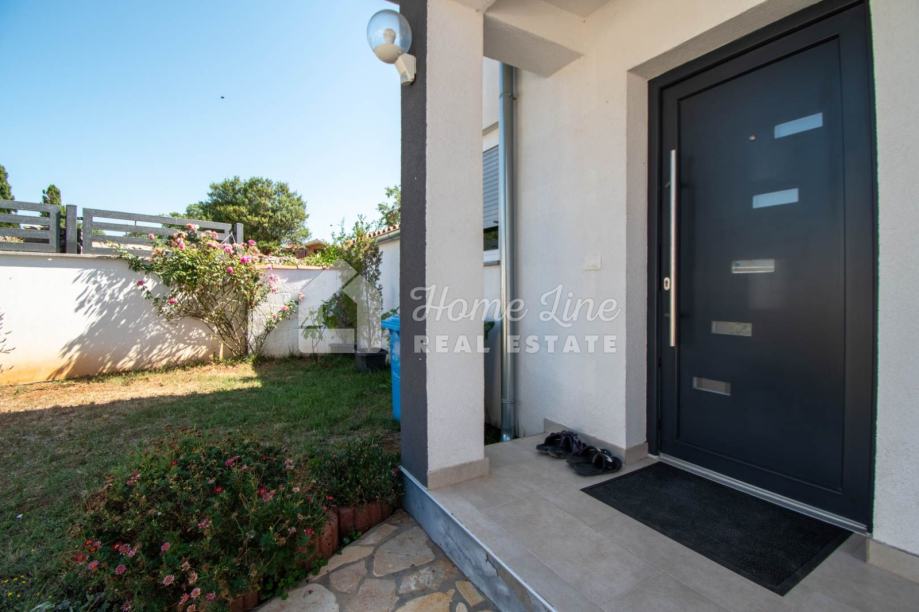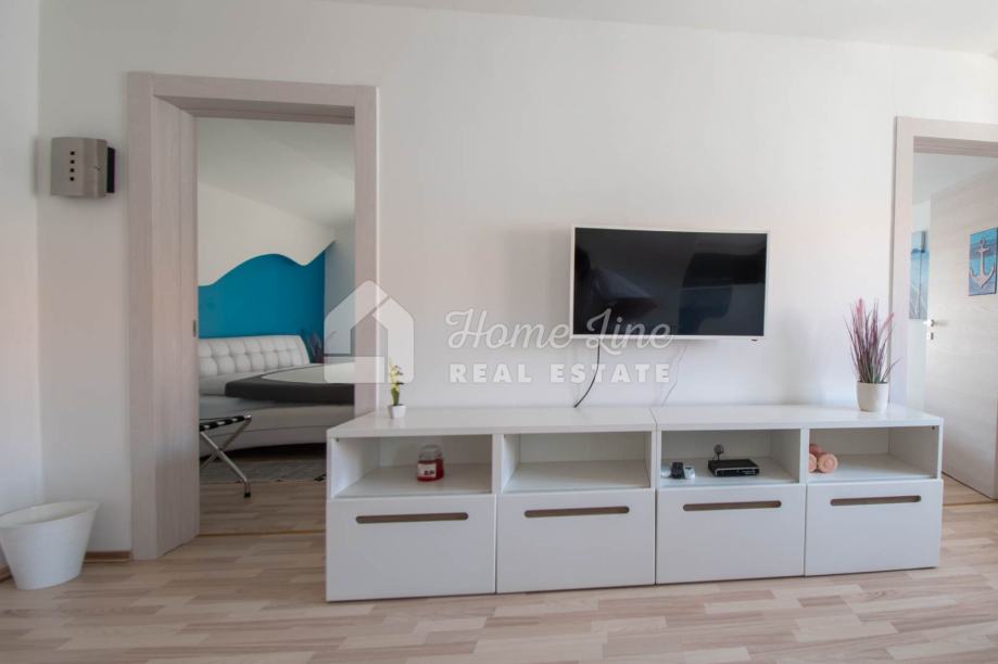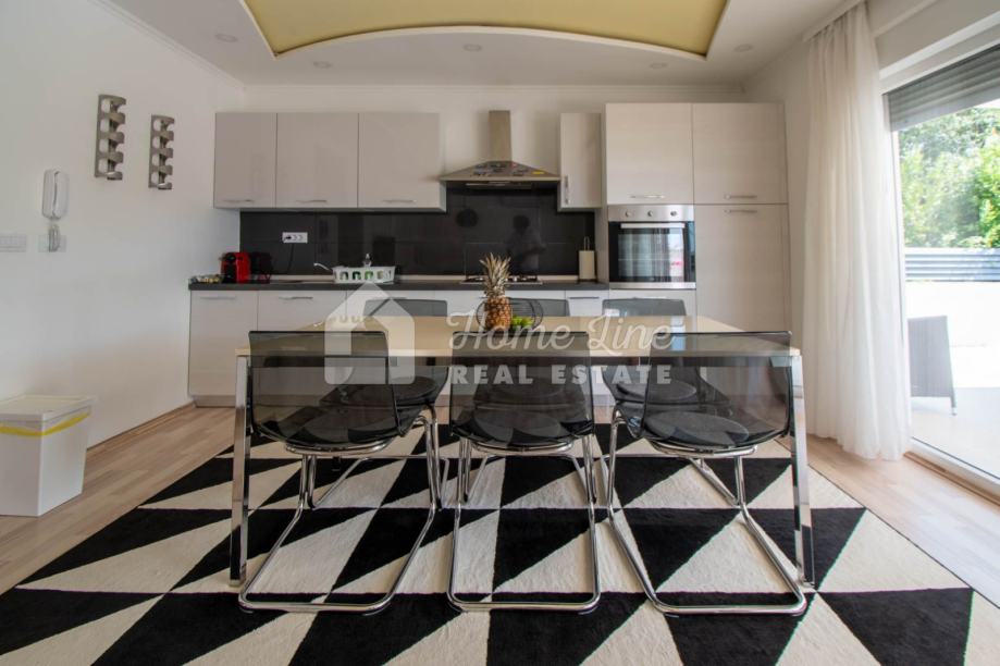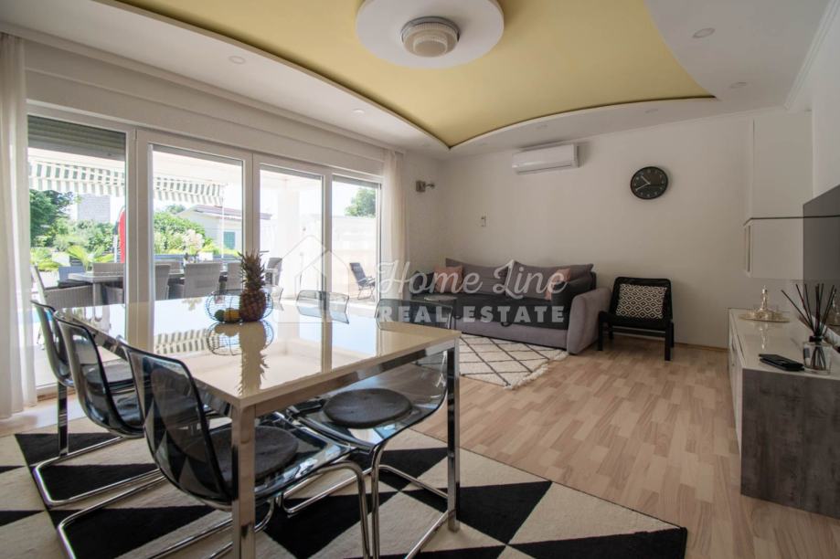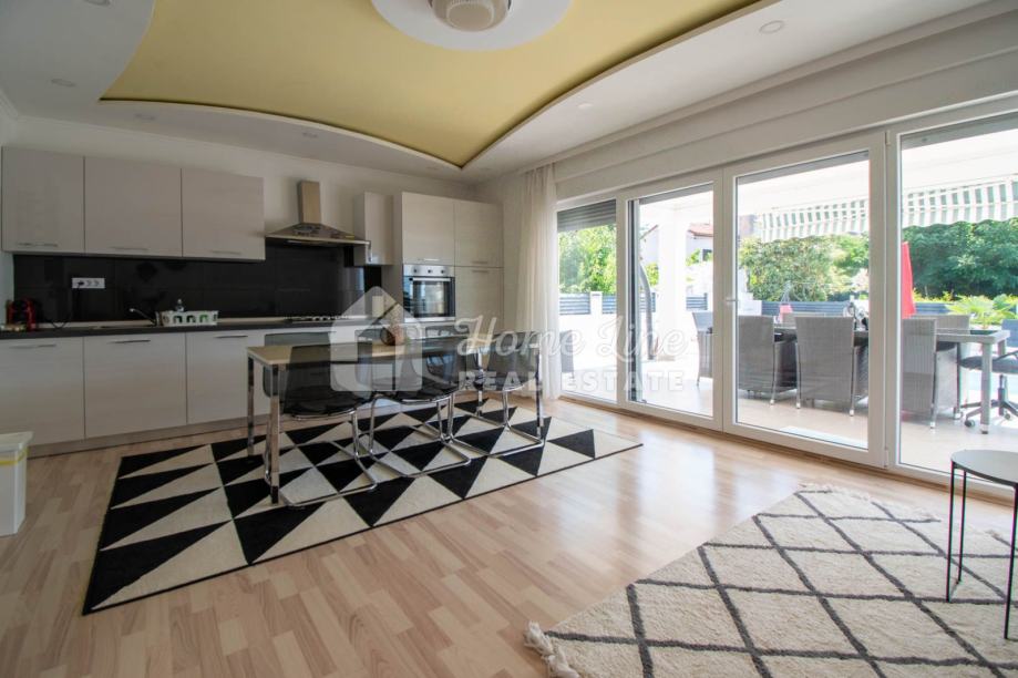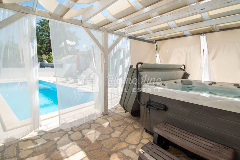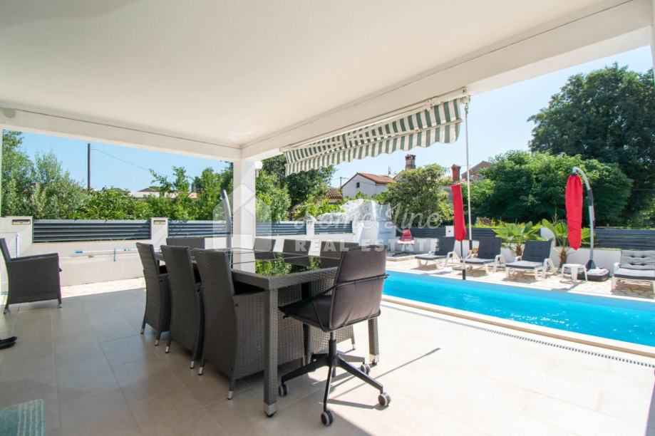 Prodaje se moderna kuća s bazenom na mirnoj lokaciji u Krnici. Izgrađena je 2015. godine na parceli površine 426 m2 sa bazenom površine 21 m2, jacuzzijem i vrtnom kućicom. Sastoji se od prizemlja i kata ukupne površine 163 m2. Prizemlje čini stan koji se sastoji od dvije spavaće sobe, kupaonice, kuhinje i dnevnog boravka sa izlazom na prostranu natkrivenu terasu. Unutarnje stepenice vode na kat na kojemu je smješten stan kojega čine dvije spavaće sobe, kupaonica, kuhinja i dnevni boravak te prostrana natkrivena terasa. Kuća se kompletno namještena i opremljena te se kao takva prodaje. Grijanje/hlađenje izvedeno je sa inverter klima uređajima i peći na kruta goriva. Okućnica je ograđena zidom, uređena te ima osigurana dva parkirna mjesta. nalazi se na mirnoj lokaciji udaljenoj 200 metara od svih potrebnih sadržaja te 3 km od plaže.