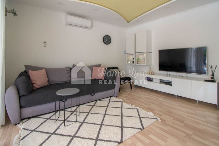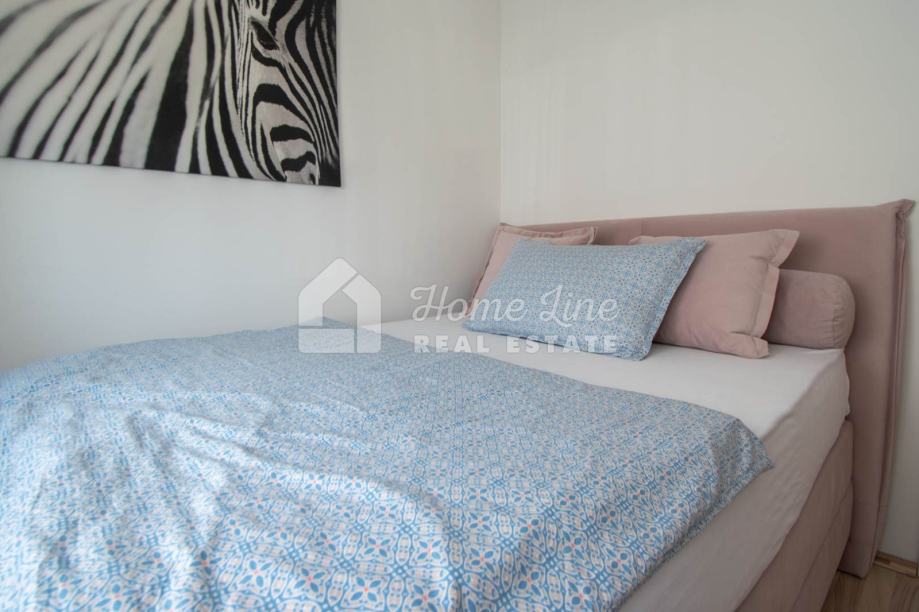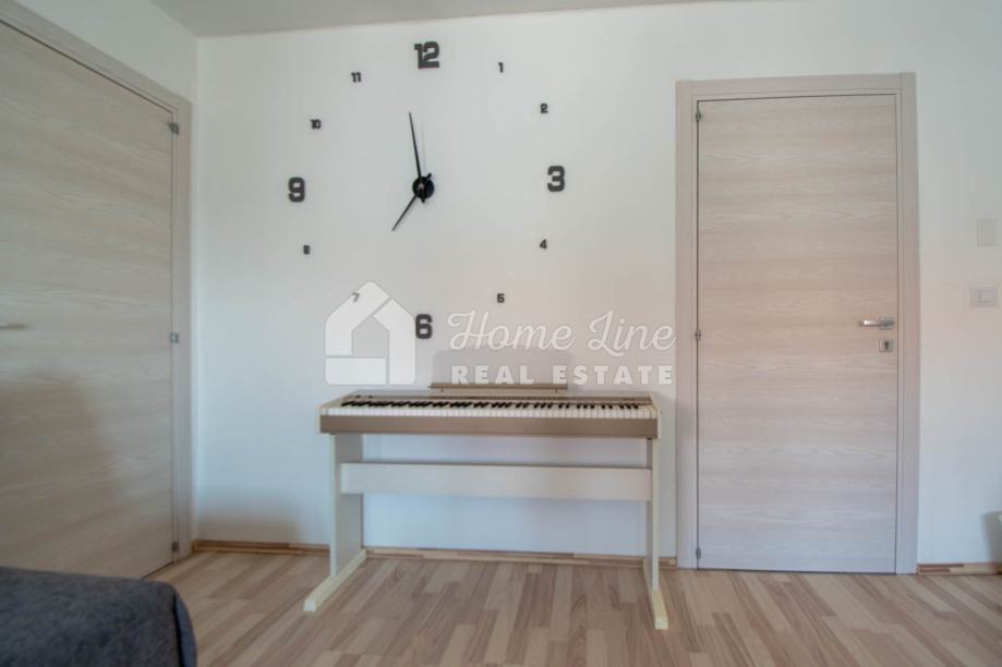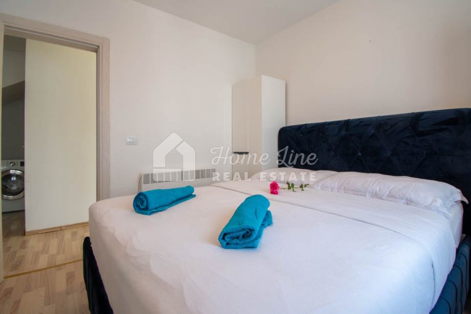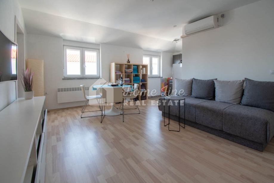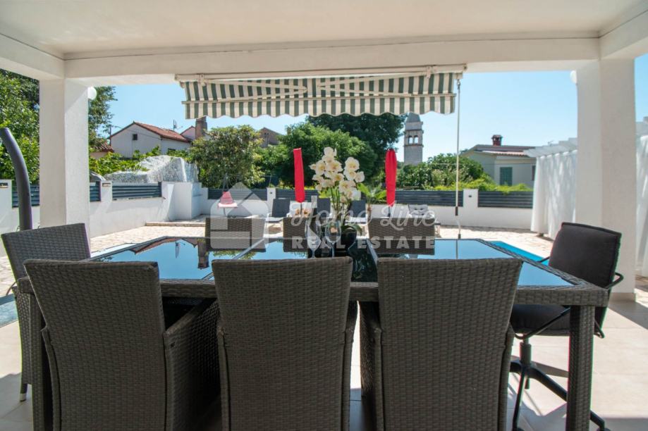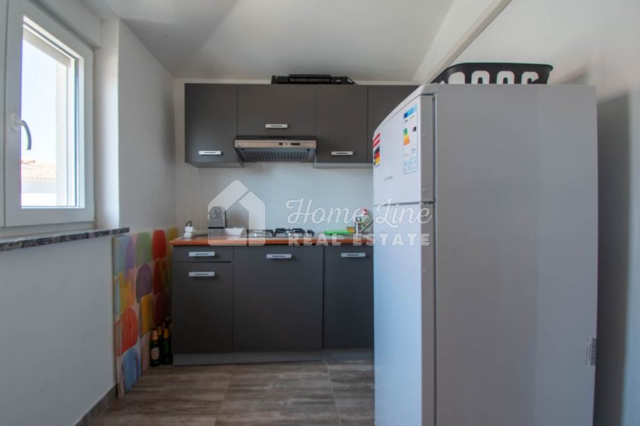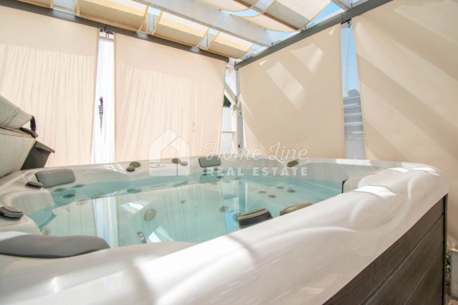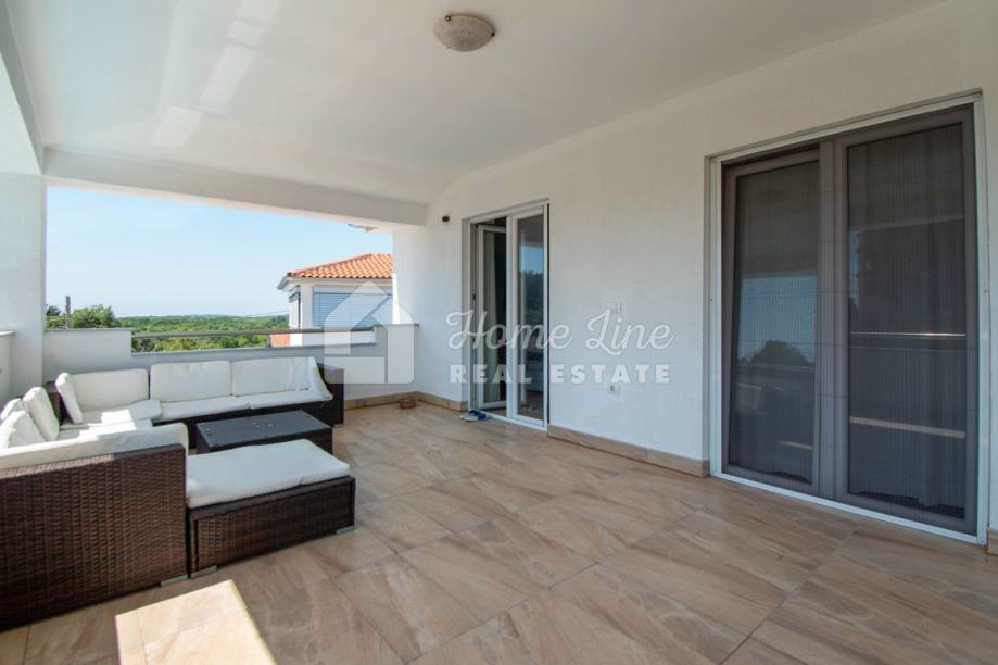 Prodaje se moderna kuća s bazenom na mirnoj lokaciji u Krnici. Izgrađena je 2015. godine na parceli površine 426 m2 sa bazenom površine 21 m2, jacuzzijem i vrtnom kućicom. Sastoji se od prizemlja i kata ukupne površine 163 m2. Prizemlje čini stan koji se sastoji od dvije spavaće sobe, kupaonice, kuhinje i dnevnog boravka sa izlazom na prostranu natkrivenu terasu. Unutarnje stepenice vode na kat na kojemu je smješten stan kojega čine dvije spavaće sobe, kupaonica, kuhinja i dnevni boravak te prostrana natkrivena terasa. Kuća se kompletno namještena i opremljena te se kao takva prodaje. Grijanje/hlađenje izvedeno je sa inverter klima uređajima i peći na kruta goriva. Okućnica je ograđena zidom, uređena te ima osigurana dva parkirna mjesta. nalazi se na mirnoj lokaciji udaljenoj 200 metara od svih potrebnih sadržaja te 3 km od plaže.