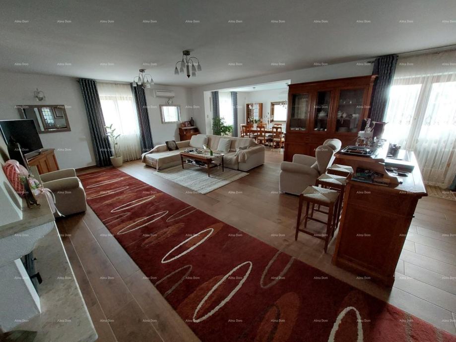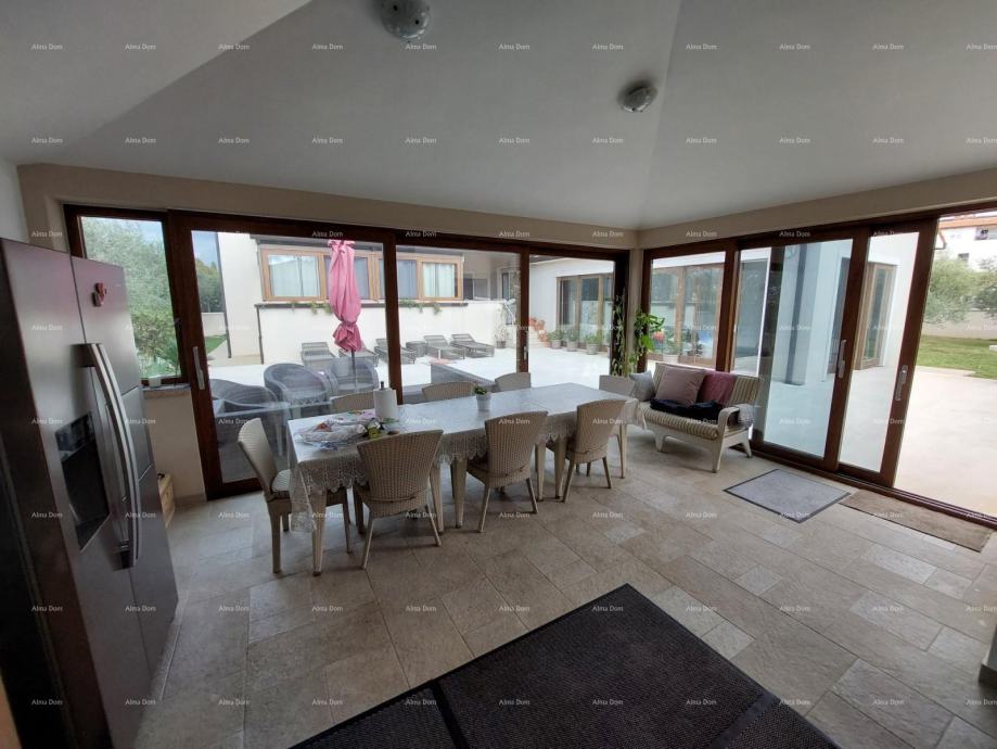 Prodaje se prekrasna kuća u Vodnjanu sa dva stana i unutarnjim bazenom. Zemljište na kojem je kuća napravljena veličine je 1683m2. Kuća se sastoji od podruma, prizemlja i prvog kata. Kuća je velika 489m2. Na prvom katu nalaze se dva stana te svaki stan ima svoj zaseban ulaz. Prvi stan je dvoetažni te se na prvoj etaži nalazi blagavaonica, kuhinja sa dnevnim boravkom i blagavaonicom, gardaroba te toalet za goste. Drugoj etaži se pristupa preko unutarnjeg stepeništa koje vodi na drugi kat kuće gdje se nalaze tri spavaće sobe sa vlastitim kupatilom. Također sa drugog kata se izlazi na prostranu terasu koja je dijelom natkrivena i nenatkrivena drugim dijelom. Stan koji se nalazi u prizemlju je jednoetažni te je veličine 43m2. Jednoetažni stan se sastoji od dnevnog boravka sa kuhinjom, blagovaonicom, spavaćom sobom i jednim kupatilom. Unutarnji bazen je veličine 18m2 odnosno dimenzija 6x3. također u kući se nalaze dvije velike zatvorene terase i moderna ljetna kuhinja. Kuća se nalazi na sređenoj, zatvorenoj okućnici. U svakoj sobi se nalaze klima uređaji te je kuća skroz klimatizirana. Kuća se prodaje potpuno namještena. Kuća se nalazi nekoliko stotina metara od glavnog gradskog traga, trgovina i svih bitnih sadržaja ali je opet u dijelu Vodnjana koji je miran te nema previše prometa. Kuća se nalazi 6 minuta vožnje automobilom do prve plaže te se nalazi 12 minuta do Pule. Kuće se može baviti turizmom i iznajmljivanjem te je pogodna za ugodan i dug boravak.
