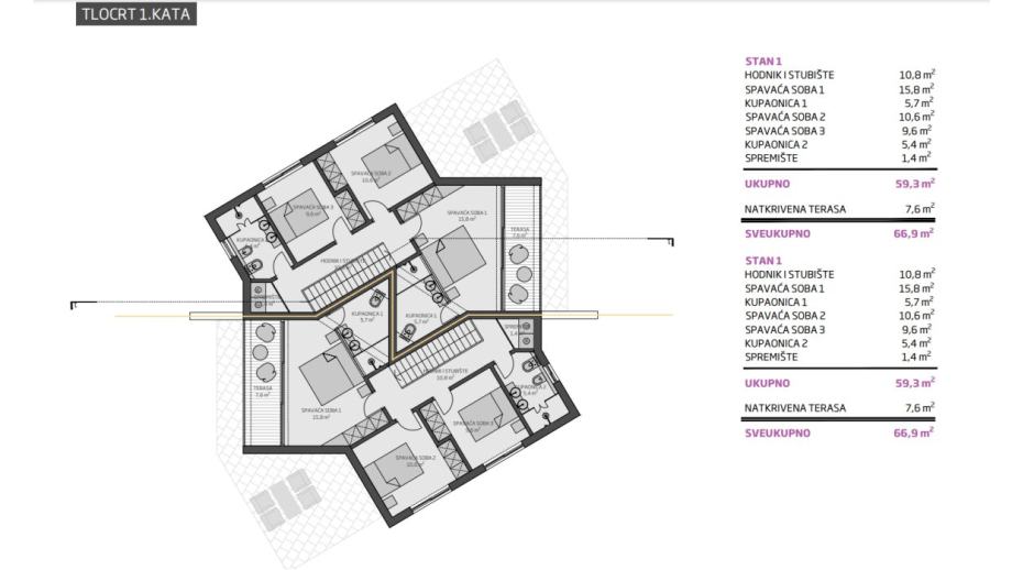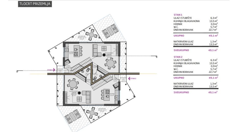 Svaka stambena jedinica ima 116 četvornih metara uz vanjski bazen i dva parkirna mjesta.