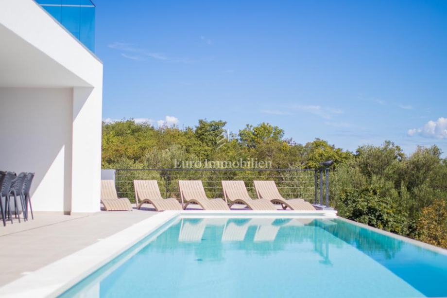 U uređenom dvorištu smještena je natkrivena terasa površine 33,60 m², sunčalište, preljevni bazen površine 42 m² te roštilj.