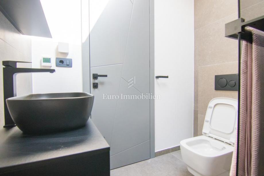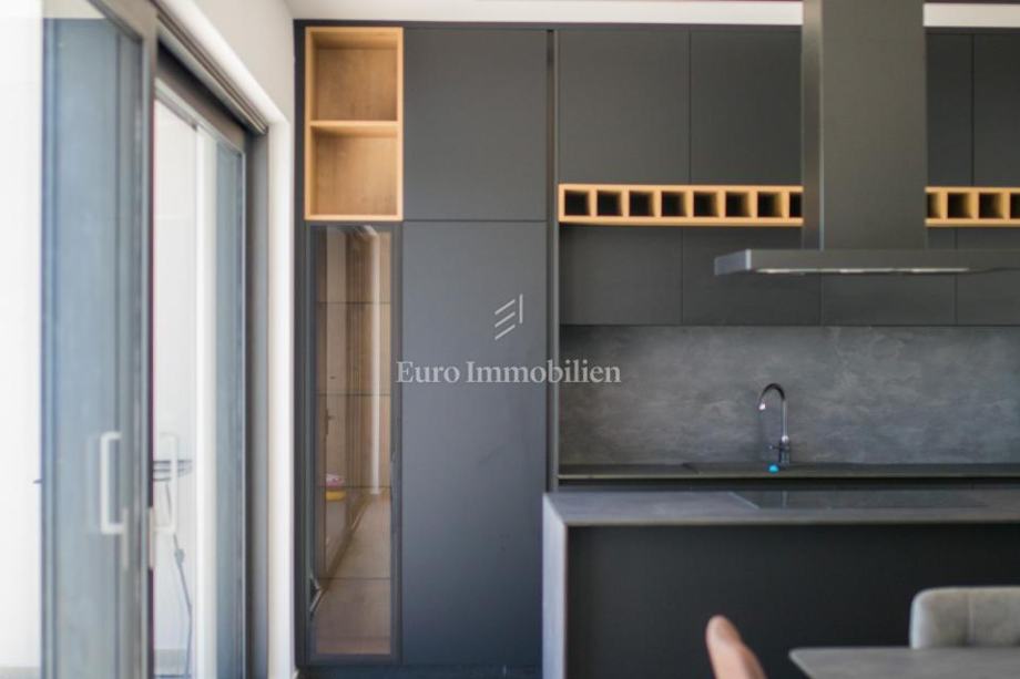 Kuća ukupne stambene površine 180 m² proteže se na prizemlje i kat. U prizemlju se nalaze garaža površine 21,70 m², prostrani dnevni boravak s kuhinjom i blagovaonicom, spremište s perilicom i sušilicom rublja, hodnik, kupaonica te prostorija za vježbanje (teretana).