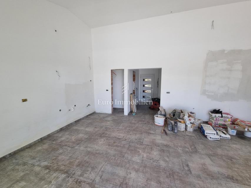 Kuća ukupne stambene površine 180 m2 sastoji se od suterena i prizemlja, a smještena je na parceli od 880 m2. Vanjskim stepenicama dolazi se na ravni krov kuće gdje je smještena terasa površine 86 m2 s koje se pruža zaista prekrasan pogled na more. U suterenu se nalaze strojarnica i prostorija koja je namijenjena za teretanu i saunu. Prizemlje se sastoji od tri spavaće sobe, svaka s vlastitom kupaonicom, spremište, toalet, kuhinja s blagovaonicom i dnevni boravak s izlazom na natkrivenu terasu gdje je smještena vanjska kuhinja. Podno grijanje postavljeno je u svim prostorijama, a u svakoj prostoriji nalazi se klima uređaj. Kuća je okrenuta prema moru i ima pogled na more iz svih prostorija. Prodaje se u potpunosti dovršena, bez namještaja. Na okućnici uređenoj u mediteranskom stilu su predviđena tri parkirna mjesta i infinity pool dimenzija 8,00 x 4,00 m.