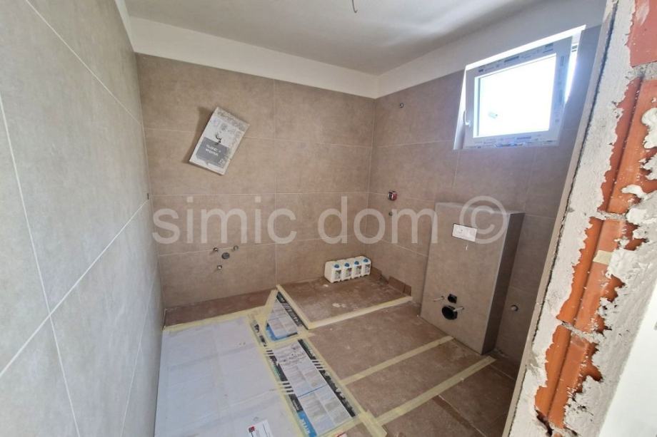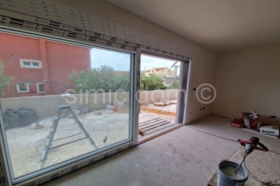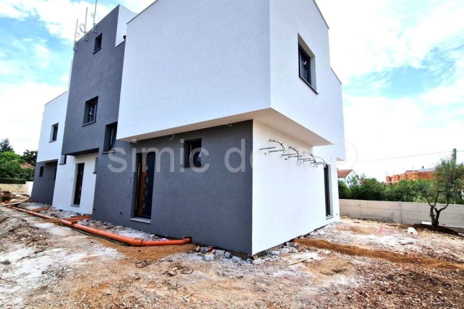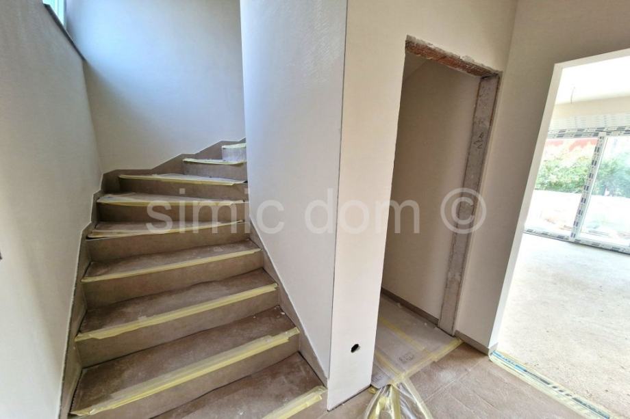 Na prodaju je kuća u nizu, u novogradnji smještenoj samo 200m od predivne šljunčane plaže u Vodicama. Kuća ima ukupnu površinu od 270 m2, odnosno 136 m2 neto korisne površine, od čega je 100 m2 unutarnjeg prostora. Proteže se na dvije etaže. U prizemlju se nalazi ulazni prostor, kupaonica, te kuhinja otvorenog koncepta s blagovaonicom i dnevnim boravkom iz kojeg se izlazi u predivan vrt od ukupno 170 m2 podne površine, a u sklopu kojeg se nalazi i prostor za sunčalište i jacuzzi te popločani dio sa dva parkirna mjesta. Unutarnje stepenište vodi na prvi kat na kojem se nalaze tri spavaće sobe te još jedna kupaonica. Ovaj objekt modernog dizajna biti će opremljen prema posljednjem standardu gradnje. Od opreme izdvajamo: stiropor fasada 8 cm, PVC prozori i vrata antracit boje sa ugrađenim komarnicima i rolete s elektromotorom, kvalitetne keramičke pločice, kvalitetni laminati u sobama, kupaonske sanitarije Grohe, klima uređaji s Wi-Fi upravljanjem, podno grijanje u kupaonicama i dnevnom boravku, staklene ograde na terasama, priprema za jacuzzi u vrtu… Planirani rok završetka gradnje je 15.08.2025.godine. Vrhunska lokacija ove nekretnine garantirati će vlasnicima predivan odmor u blizini plaže i svih ostalih sadržaja grada Vodica, ali i odličnu investiciju.