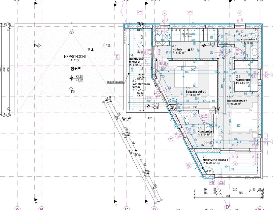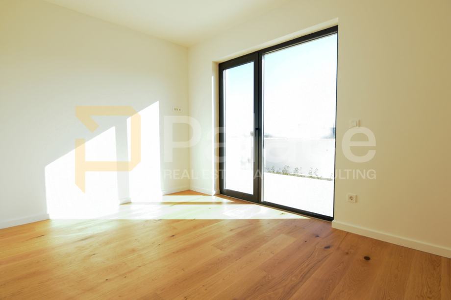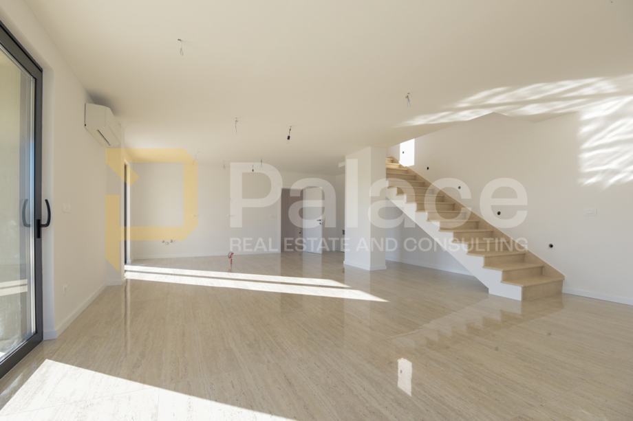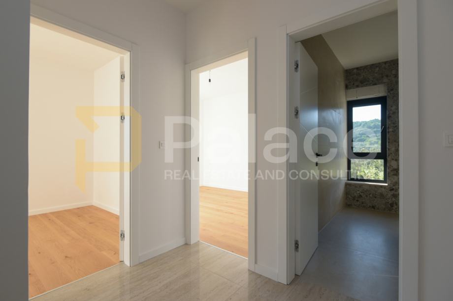 Unutarnjim stubištem pristupa se i prvom katu na kojem su smještene tri spavaće sobe sa kupaonicom, od kojih jedna ima i vlastiti garderobni prostor. Svaka od soba ima pristup vanjskom prostoru na balkonu i terasi. Podno grijanje provedeno je kroz sve prostorije, kao i klimatizacijski sistemi, dok su vrtovi opremljeni sistemom navodnjavanja.