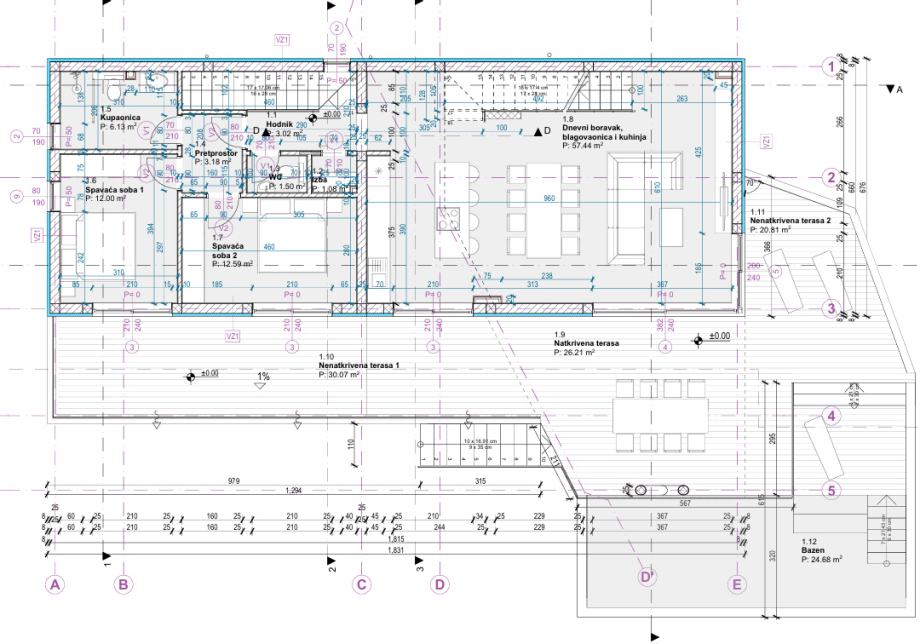 Vila ukupne veličine 259 m2, prostire se na suteren, prizemlje i prvi kat. U suterenu vile smještena je velika garaža, spremište i vešeraj. Unutarnjim stubištem pristupa se prizemlju, u kojem se nalazi veliki open space dnevni boravak sa kuhinjom i blagovaonicom, hodnik sa wc-om i spavaća soba sa kupaonicom. Velike staklene stijene u svim prostorijama i vanjske terase kojima se može pristupiti iz svih prostorija pružaju izuzetan osjećaj topline i prozračnosti cijelom prostoru sa pregršt prirodnog svijetla.