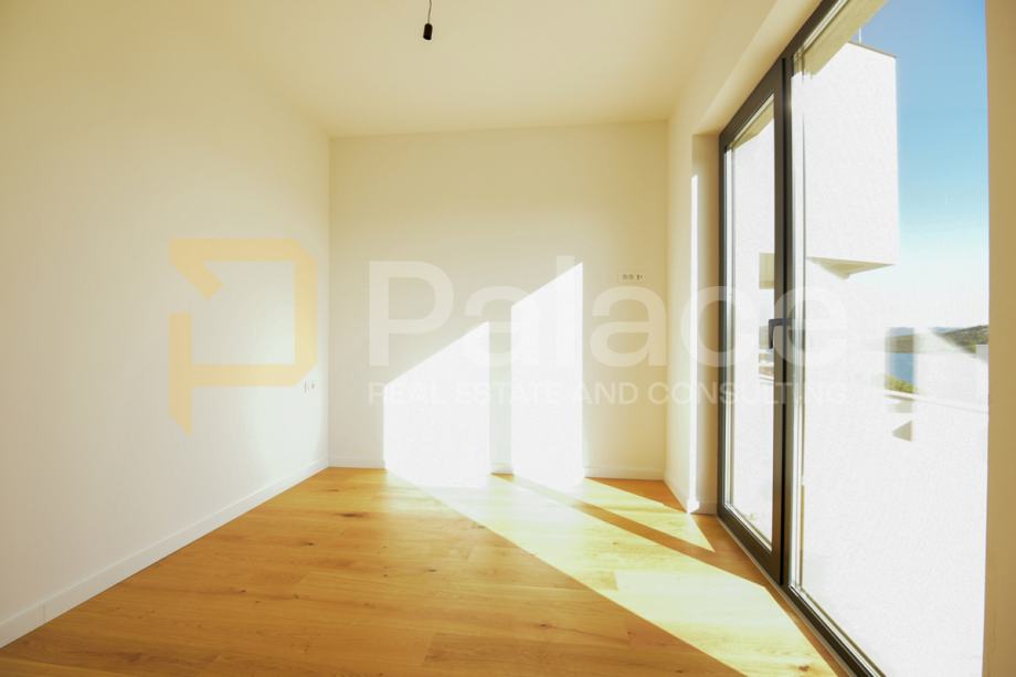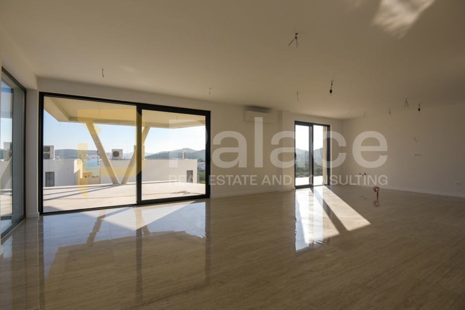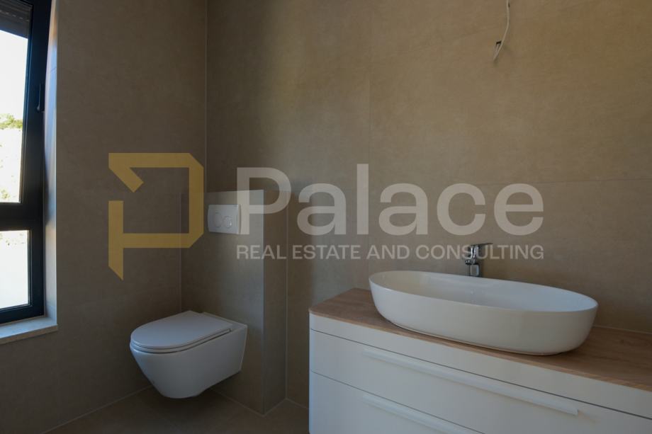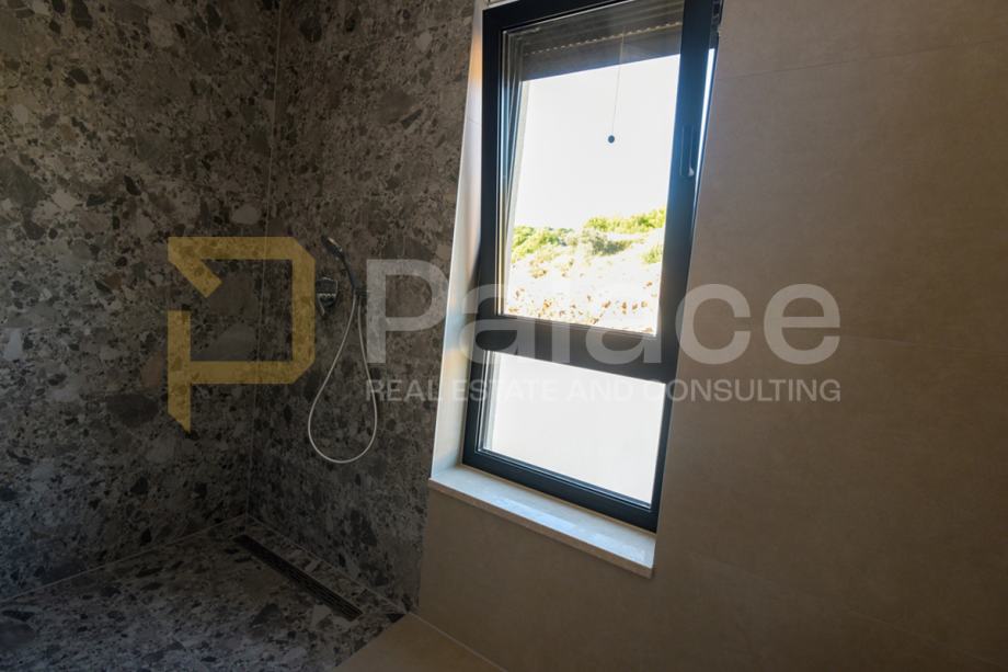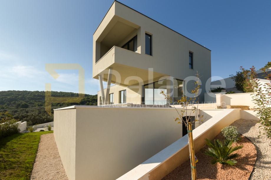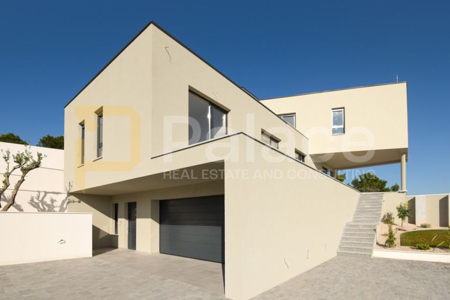 Odlična lokacija sa panoramskim pogledom i hodom udaljena od plaže, pomno osmišljen raspored kojim se pruža pogleda na more iz svih prostorija i visoki standardi gradnje, čine ovu nekretninu idealnom obiteljskom luksuznom vilom. Okućnica s bazenom, uređenim vrtovima i vanjskim parkirnim mjestima, prostire se na ukupno 390 m2. Vila je i cijelosti izgrađena, i trenutno je u fazi uređenja završnih detalja.