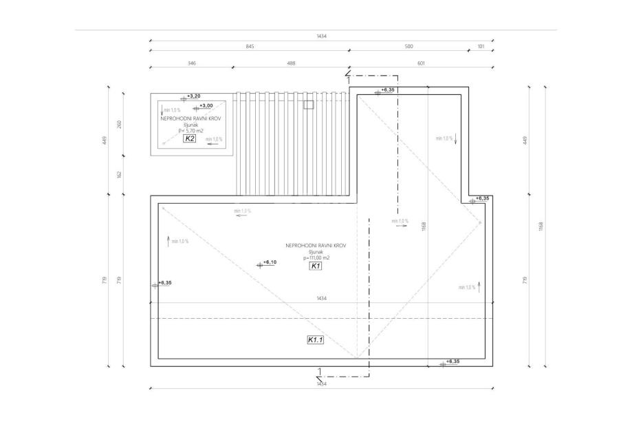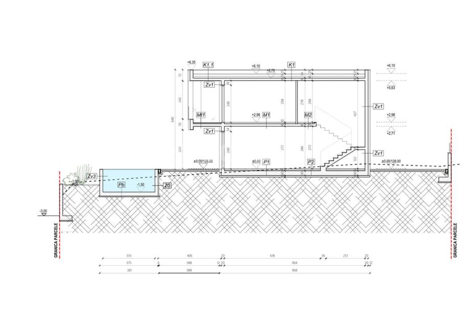 Netto površina (zatvoreni dio): cca 210,30 m² (podrum 65,00 m² + prizemlje 71,70 m² + kat 73,60 m²). Dodatno: natkrivena terasa u prizemlju 28,88 m², natkrivene terase na katu ukupno 27,75 m², natkrivena ljetna kuhinja 20,10 m² te spremište 5,70 m².