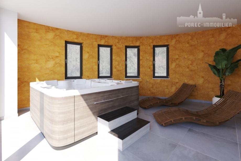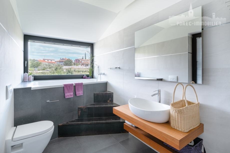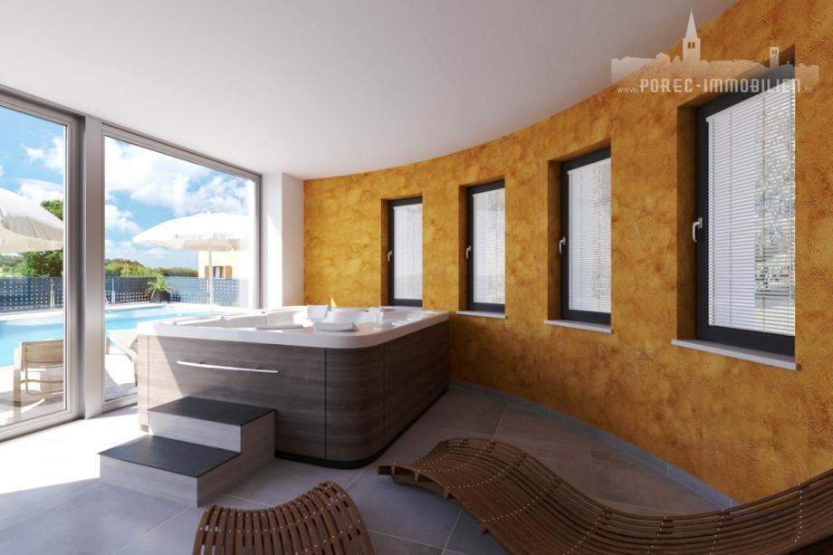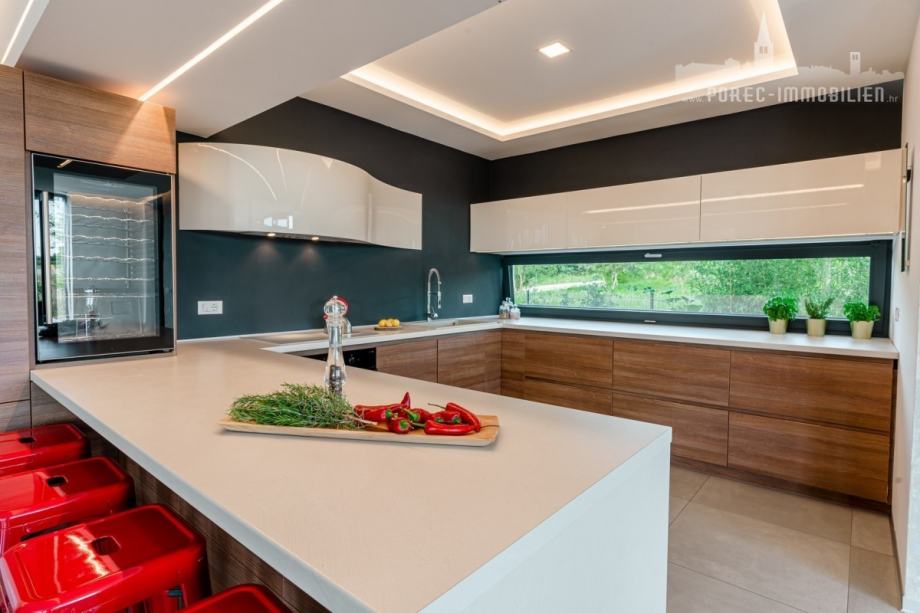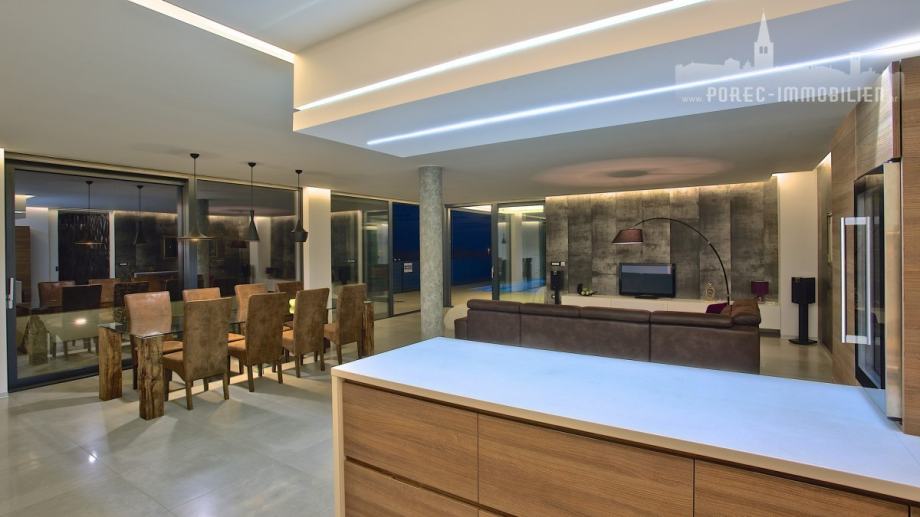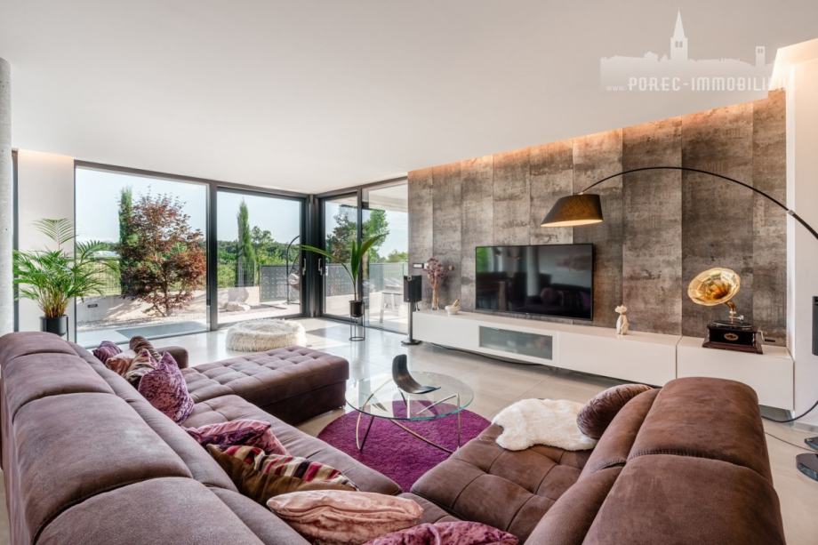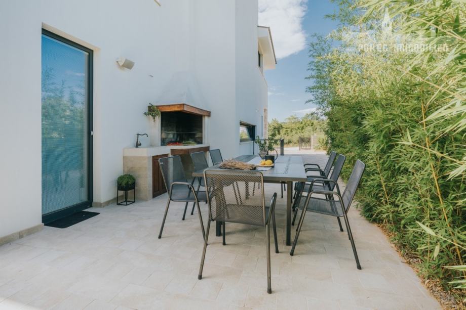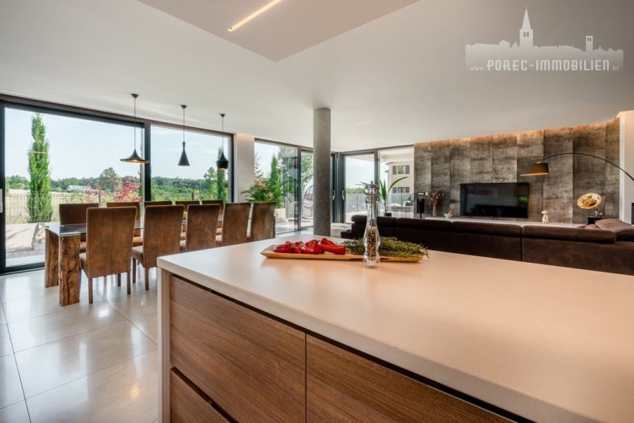 Prekrasna moderna vila od 370 m2, nalazi se na udaljenosti od 1 km od šarmantnog istarskog gradića sa kompletnim sadržajima i infrastrukturom, kao što su market, restoran, caffe bar, banka, pošta, ambulanta, apoteka i još puno toga...
