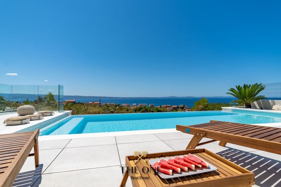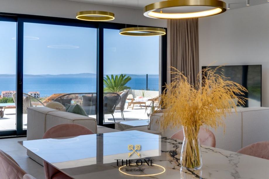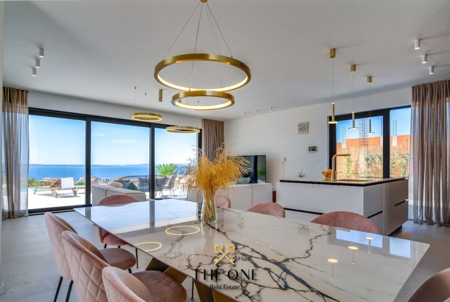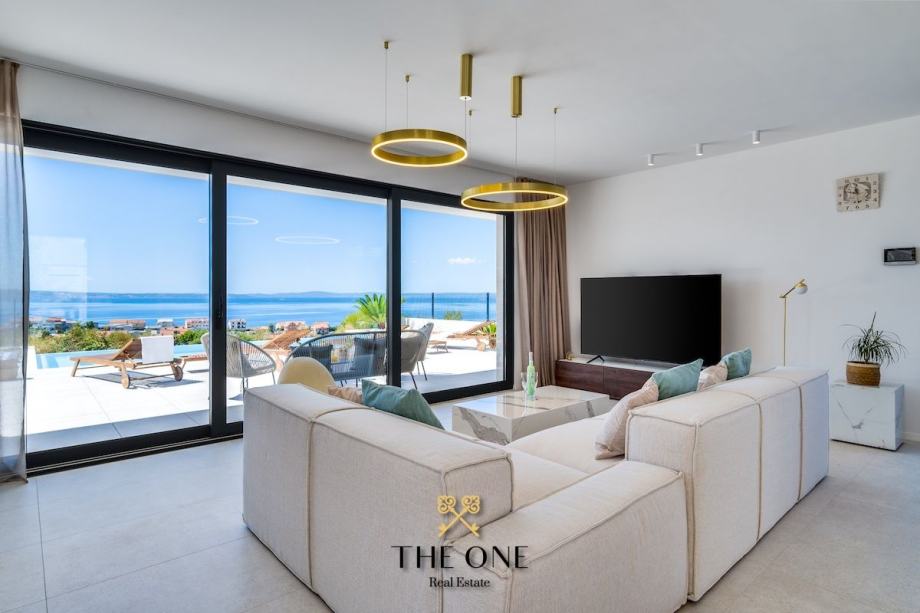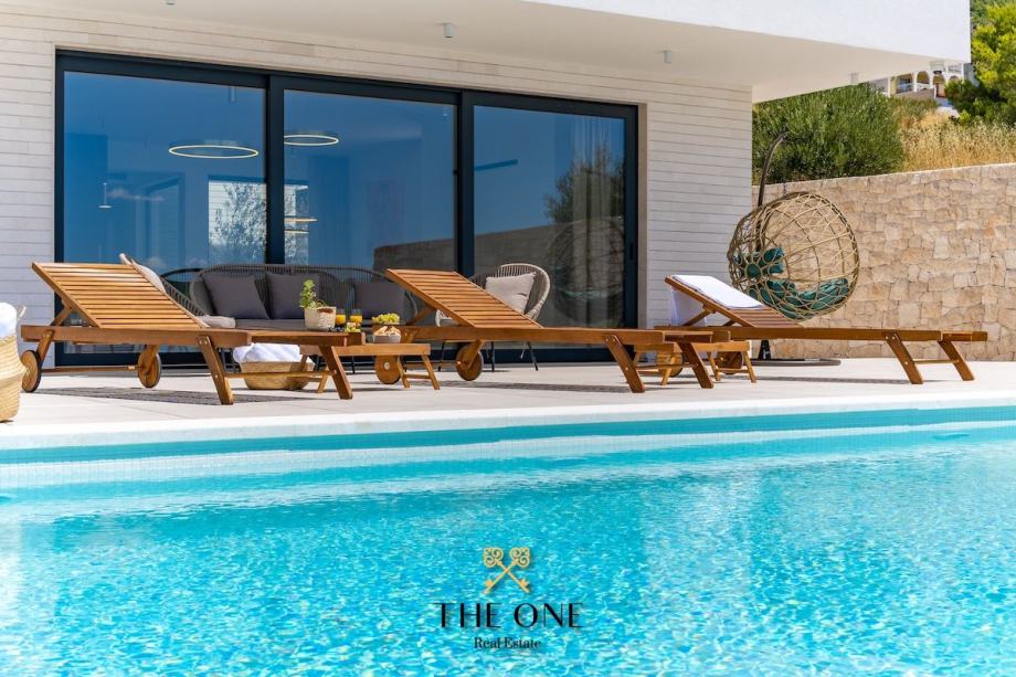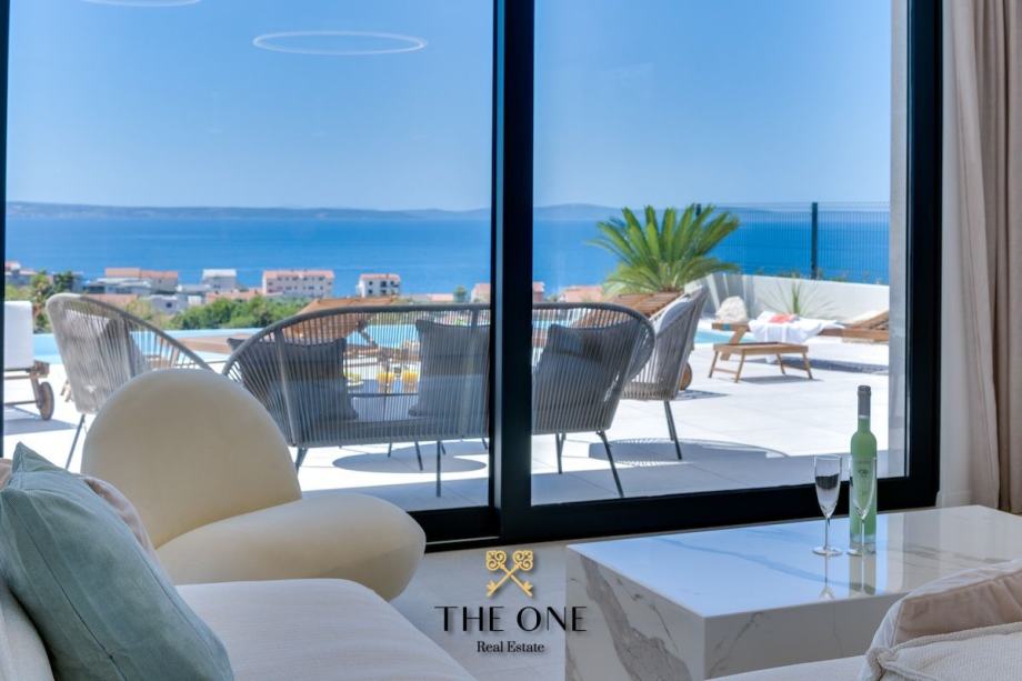Moderna luksuzna vila s pogledom na more nalazi se u blizini Splita i nudi izuzetno udoban životni prostor. Smještena na blagoj padini, vila pruža spektakularan panoramski pogled na more i okolicu. Prostire se na 3 etaže i okružena je ograđenom okućnicom koja je očaravajuće uređena sa stablima palmi i maslina.